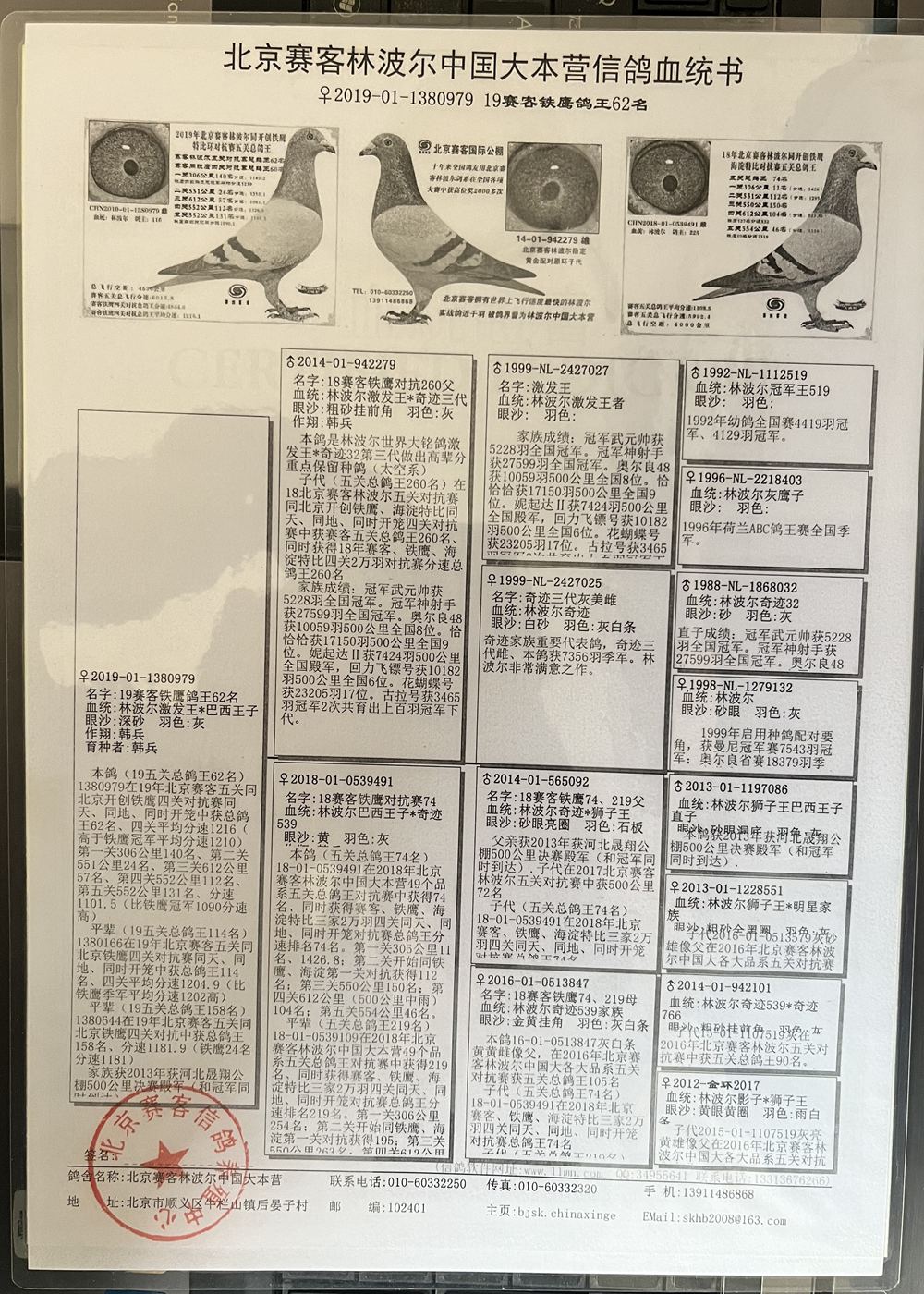 本鴿(19五關(guān)總鴿王62名) 1380979在19年北京賽客五關(guān)同北京開創(chuàng)鐵鷹四關(guān)對抗賽同天、同地、同時開籠中獲總鴿王62名、四關(guān)平均分速1216( 高于鐵鷹冠軍平均分速1210) 第一關(guān)306公里140名、第二關(guān)551公里24名、第關(guān)612公里57名、第四關(guān)552公里112名、 第五關(guān)552公里131名、分速1101.5(比鐵鷹冠軍1090分速高)