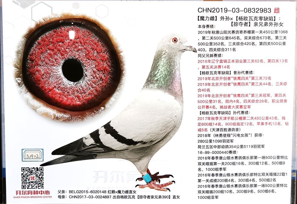父:BELG2015-6020148 紅眼×魔力雌直女 雄 灰白條 黃眼 子代賽績: 2016年遼寧盤錦正本羽業(yè)第一關450公里352名,第二關500公里153名,第三關62名,第四關13名,第五關決賽14名