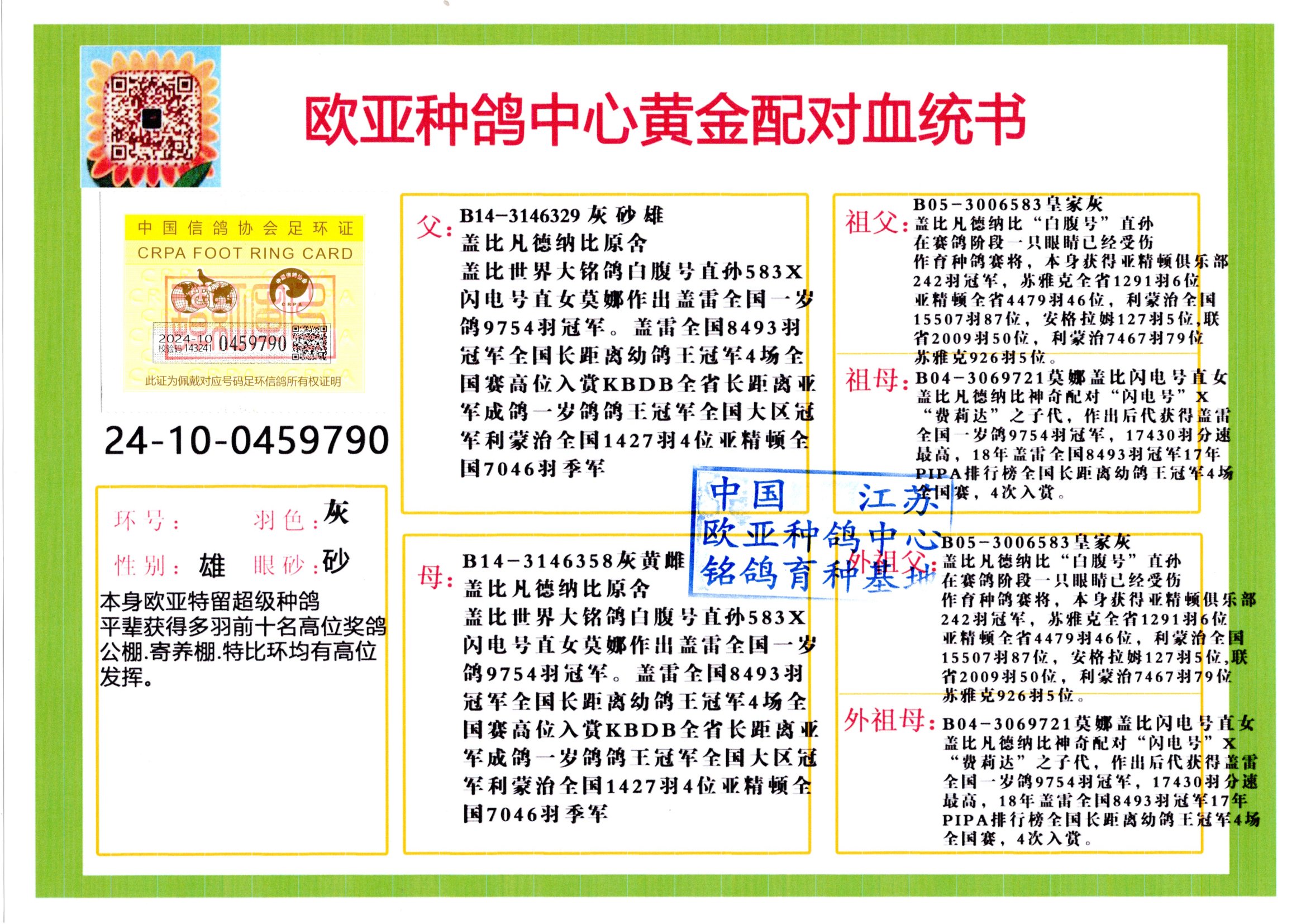 24年秋南京特比環(huán)歐亞榮獲大團(tuán)體冠軍.小團(tuán)體冠軍551公里大特比13名.14名.16名.19名.20名.21名.24名.26名.27名.28名.42名.52名.54名.57名.65名.66名.68名.70名.71名.72名.74名.76名.80名.82名.83名.84名.85名.86名.90名.92名.110名.116名.121名.122名.128名.131名.158名.161名.164名.165名.166名.172名.174名.177名.182名.195名.196名.201名.205名.208名.210名.216名.253名.269名.275名.276名.294名.296名.299名,,24年秋云南天南銅都公棚決賽415名.天南銅都小棚決賽409名.云南玉活公棚決賽102名.490名.團(tuán)體32名上籠二羽進(jìn)二羽,天南銅都大棚506公里決賽445名。熱烈祝賀河北省巨鹿縣李蘭生老師用歐亞泰山號血系連續(xù)十一年奪冠軍,河北省國家賽冠軍.全國季軍等多次前十名高位,揚(yáng)州王軍王總用歐亞利奧24年春季獲山東翔宇公棚決賽33名蓋比53名。南京劉正龍劉總用歐亞蓋比獲得24年秋山東濰坊國際公棚決賽42名.精英賽30名.三關(guān)鴿王71名.決賽86名.加站賽16名.南京市特比環(huán)A組鴿王9名.B組鴿王5名.6名.C組鴿王5名.精英賽冠軍4名.技能賽A組冠軍4名.5名.秦淮區(qū)特比環(huán)榮獲15名.46名.48名.87名。四川西昌徐亮徐總用歐亞利奧獲得涼山州聚友決賽177名.第二關(guān)亞軍雙關(guān)鴿王19名.三關(guān)鴿王105名.云南豪庭公棚決賽603名。熱烈祝賀24年四川重慶翔園鴿舍用歐亞泰山號榮獲春季400公里冠軍.秋季500公里冠軍,河北王總用詹森X利奧獲得千羽千翔公棚400公里冠軍,廣東蔡楷煥榮獲24年秋愛好者 賽鴿俱樂部三關(guān)鴿王季軍.一關(guān)420公里99名.二關(guān)450公里11名.三關(guān)520公里32名.單關(guān)季軍.7名.12名,江西李衛(wèi)興榮獲貴州紅楓公棚8名.共翔俱樂部寄養(yǎng)棚四關(guān)綜合鴿王30名.一關(guān)400公里78名.二關(guān)500公里55名.三關(guān)520公里37名.四關(guān)500公里57名.同父母獲公棚18名.雷鳴獲得武漢黃浦育翔中心冠軍,四川陳文獲得四川明鴻俱樂部300公里夢幻2名.3名.4名.9名.10名.13名.14名.15名.31名.34名.40名.41名.42名.43名.69名.71名.72名.73名.74名.94名.95名.97名.98名.99名.419公里決賽榮獲總冠軍7名.總共歸巢9羽,四川徐亮獲豪庭決賽603名,山西鄭勇獲得山西泰鑫公棚決賽255名詹森紅狐,熱烈祝賀馬總獲得開爾(飛躍隊)決賽9名獲獎金1310000萬元.第一關(guān)52名,天津津福資賽180公里96名.獲獎金429543萬元,歐亞支持全國鴿友24年秋多人報喜 祝大家取得更好成績,給歐亞報喜鴿友歐亞決定給每人贈送一羽超級種鴿。歐亞俱樂部特比環(huán)多關(guān)鴿王成績:15年秋淮安特比環(huán)黑色星期一全會上籠9700多羽,當(dāng)天無鴿歸巢,第二天全會歸巢357羽,本舍歸巢158羽.前十名八羽.前一百名歸巢57羽,16年春季獲五關(guān)鴿王總冠軍,總亞軍四名.六名.七名.九名.十名.晶藝俱樂部520公里冠亞季軍5名.6名.7名.9名.11名等,火車頭冠軍.季軍6名.8名.9名.10名,16年秋晶藝俱樂部特比環(huán)520公里亞軍.季軍4名.6名.7名.9名,15年春南京白下特比環(huán)冠軍.亞軍.季軍6名.7名.8名.9名.10名.指定鴿A B組獲得冠軍.亞軍.季軍4名.5名.,17年淮安特比環(huán)亞軍.4名.5名.7名.8名.10名.六關(guān)鴿王總冠軍.4名.6名.9名.10名,寄養(yǎng)棚宿遷劉總20羽特比環(huán)獲冠軍.季軍.4名.7名.8名.9名等。18年榮獲萬羽特比環(huán)六關(guān)鴿王總冠軍.總亞軍.總季軍.6名.8名.十名.單關(guān)四羽冠軍.二羽亞軍.四羽季軍.前十名27羽。19年秋萬羽特比環(huán)六關(guān)鴿王總亞軍.總季軍.5名.8名等,單關(guān)二羽冠軍.三羽亞軍.一羽季軍前十名31羽。20年秋淮安市鴿會四關(guān)特比環(huán)大賽風(fēng)雨無阻鴿王亞軍.鴿王六名,金品俱樂部萬羽特比環(huán)六關(guān)鴿王總冠軍,總亞軍.四名.五名.六名.七名.八名.十名.前二百名鴿王35羽,單關(guān)冠亞季軍前十名四十多羽,火車頭五關(guān)鴿王季軍.六名.八名.前二百名鴿王十七羽。20年春榮獲淮安五區(qū)一市四關(guān)鴿王總冠軍.亞軍.四名.八名.九名。21年秋榮獲金品萬羽特比環(huán)大賽六關(guān)鴿王總亞軍.總季軍.四名.七名.九名.十名.單關(guān)冠亞軍季軍前十名三十多羽;疖囶^協(xié)會鴿王六名.七名.十名.單關(guān)前十名十七羽。22年秋榮獲鴿王總冠軍.總亞軍.5名.7名.8名.9名.11名.單關(guān)冠亞季軍前十名三十多羽,第一關(guān)單關(guān)前二百名四十多羽,第二關(guān)前二百名三十多羽,第三關(guān)前二百名四十多羽,第四關(guān)前二百名四十多羽,第五關(guān)前一百名53羽。23年秋榮獲鴿王季軍.五名.八名.十名.13名.17名.20名.27名等多羽鴿王.單關(guān)前十名二十多羽。公棚.寄養(yǎng)棚部分成績:16年秋寧夏黃河公棚總冠軍電腦戈馬力指定通炮冠軍,17年送八羽參賽獲得鴿王八名進(jìn)獎四名,支持韓總榮獲八名。支持鴿友榮獲寧夏中衛(wèi)公棚決賽總冠軍.精英賽冠軍,支持18年寧夏黃河公棚決賽冠軍詹森X泰山。安徽鼎博寄養(yǎng)棚院內(nèi)外四關(guān)鴿王總冠軍.鴿王十七名.三十七名同窩,鴿王39名.42名.58名.67名。18年山東公棚預(yù)賽冠軍.決賽65名.送八羽進(jìn)獎五羽.指定獲奔馳汽車一輛。支持鴿友獲得云南藍(lán)云公棚冠軍.蓋比X佛卡門。支持鴿友榮獲云南銀集公棚決賽冠軍 詹森427X520血系 速度賽6700羽冠軍。17年榮獲金馬俱樂部寄養(yǎng)棚四關(guān)鴿王總冠軍.季軍.六名.八名.第一關(guān)冠軍.亞軍.季軍四名.七名.十一名.金牌教練獎。支持鴿