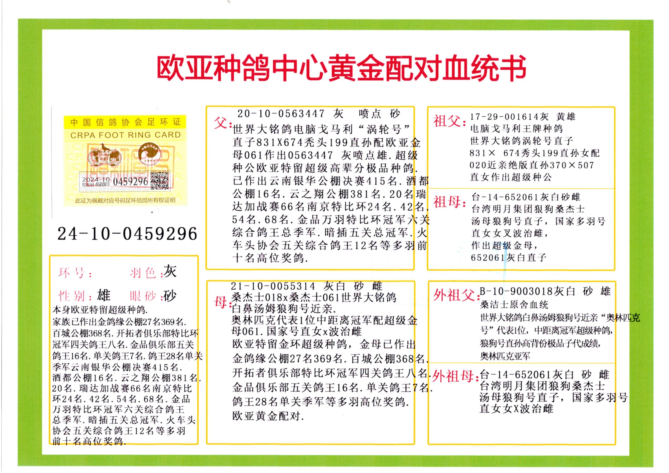 24年秋南京特比環(huán)歐亞榮獲大團(tuán)體冠軍.小團(tuán)體冠軍551公里大特比13名.14名.16名.19名.20名.21名.24名.26名.27名.28名.42名.52名.54名.57名.65名.66名.68名.70名.71名.72名.74名.76名.80名.82名.83名.84名.85名.86名.90名.92名.110名.116名.121名.122名.128名.131名.158名.161名.164名.165名.166名.172名.174名.177名.182名.195名.196名.201名.205名.208名.210名.216名.253名.269名.275名.276名.294名.296名.299名,,24年秋云南天南銅都公棚決賽415名.天南銅都小棚決賽409名.云南玉活公棚決賽102名.490名.團(tuán)體32名上籠二羽進(jìn)二羽,天南銅都大棚506公里決賽445名。熱烈祝賀河北省巨鹿縣李蘭生老師用歐亞泰山號(hào)血系連續(xù)十一年奪冠軍,河北省國(guó)家賽冠軍.全國(guó)季軍等多次前十名高位,揚(yáng)州王軍王總用歐亞利奧24年春季獲山東翔宇公棚決賽33名蓋比53名。南京劉正龍劉總用歐亞蓋比獲得24年秋山東濰坊國(guó)際公棚決賽42名.精英賽30名.三關(guān)鴿王71名.決賽86名.加站賽16名.南京市特比環(huán)A組鴿王9名.B組鴿王5名.6名.C組鴿王5名.精英賽冠軍4名.技能賽A組冠軍4名.5名.秦淮區(qū)特比環(huán)榮獲15名.46名.48名.87名。四川西昌徐亮徐總用歐亞利奧獲得涼山州聚友決賽177名.第二關(guān)亞軍雙關(guān)鴿王19名.三關(guān)鴿王105名.云南豪庭公棚決賽603名。熱烈祝賀24年四川重慶翔園鴿舍用歐亞泰山號(hào)榮獲春季400公里冠軍.秋季500公里冠軍,河北王總用詹森X利奧獲得千羽千翔公棚400公里冠軍,廣東蔡楷煥榮獲24年秋愛(ài)好者 賽鴿俱樂(lè)部三關(guān)鴿王季軍.一關(guān)420公里99名.二關(guān)450公里11名.三關(guān)520公里32名.單關(guān)季軍.7名.12名,江西李衛(wèi)興榮獲貴州紅楓公棚8名.共翔俱樂(lè)部寄養(yǎng)棚四關(guān)綜合鴿王30名.一關(guān)400公里78名.二關(guān)500公里55名.三關(guān)520公里37名.四關(guān)500公里57名.同父母獲公棚18名.雷鳴獲得武漢黃浦育翔中心冠軍,四川陳文獲得四川明鴻俱樂(lè)部300公里夢(mèng)幻2名.3名.4名.9名.10名.13名.14名.15名.31名.34名.40名.41名.42名.43名.69名.71名.72名.73名.74名.94名.95名.97名.98名.99名.419公里決賽榮獲總冠軍7名.總共歸巢9羽,四川徐亮獲豪庭決賽603名,山西鄭勇獲得山西泰鑫公棚決賽255名詹森紅狐,熱烈祝賀馬總獲得開(kāi)爾(飛躍隊(duì))決賽9名獲獎(jiǎng)金1310000萬(wàn)元.第一關(guān)52名,天津津福資賽180公里96名.獲獎(jiǎng)金429543萬(wàn)元,歐亞支持全國(guó)鴿友24年秋多人報(bào)喜 祝大家取得更好成績(jī),給歐亞報(bào)喜鴿友歐亞決定給每人贈(zèng)送一羽超級(jí)種鴿。歐亞俱樂(lè)部特比環(huán)多關(guān)鴿王成績(jī):15年秋淮安特比環(huán)黑色星期一全會(huì)上籠9700多羽,當(dāng)天無(wú)鴿歸巢,第二天全會(huì)歸巢357羽,本舍歸巢158羽.前十名八羽.前一百名歸巢57羽,16年春季獲五關(guān)鴿王總冠軍,總亞軍四名.六名.七名.九名.十名.晶藝俱樂(lè)部520公里冠亞季軍5名.6名.7名.9名.11名等,火車頭冠軍.季軍6名.8名.9名.10名,16年秋晶藝俱樂(lè)部特比環(huán)520公里亞軍.季軍4名.6名.7名.9名,15年春南京白下特比環(huán)冠軍.亞軍.季軍6名.7名.8名.9名.10名.指定鴿A B組獲得冠軍.亞軍.季軍4名.5名.,17年淮安特比環(huán)亞軍.4名.5名.7名.8名.10名.六關(guān)鴿王總冠軍.4名.6名.9名.10名,寄養(yǎng)棚宿遷劉總20羽特比環(huán)獲冠軍.季軍.4名.7名.8名.9名等。18年榮獲萬(wàn)羽特比環(huán)六關(guān)鴿王總冠軍.總亞軍.總季軍.6名.8名.十名.單關(guān)四羽冠軍.二羽亞軍.四羽季軍.前十名27羽。19年秋萬(wàn)羽特比環(huán)六關(guān)鴿王總亞軍.總季軍.5名.8名等,單關(guān)二羽冠軍.三羽亞軍.一羽季軍前十名31羽。20年秋淮安市鴿會(huì)四關(guān)特比環(huán)大賽風(fēng)雨無(wú)阻鴿王亞軍.鴿王六名,金品俱樂(lè)部萬(wàn)羽特比環(huán)六關(guān)鴿王總冠軍,總亞軍.四名.五名.六名.七名.八名.十名.前二百名鴿王35羽,單關(guān)冠亞季軍前十名四十多羽,火車頭五關(guān)鴿王季軍.六名.八名.前二百名鴿王十七羽。20年春榮獲淮安五區(qū)一市四關(guān)鴿王總冠軍.亞軍.四名.八名.九名。21年秋榮獲金品萬(wàn)羽特比環(huán)大賽六關(guān)鴿王總亞軍.總季軍.四名.七名.九名.十名.單關(guān)冠亞軍季軍前十名三十多羽;疖囶^協(xié)會(huì)鴿王六名.七名.十名.單關(guān)前十名十七羽。22年秋榮獲鴿王總冠軍.總亞軍.5名.7名.8名.9名.11名.單關(guān)冠亞季軍前十名三十多羽,第一關(guān)單關(guān)前二百名四十多羽,第二關(guān)前二百名三十多羽,第三關(guān)前二百名四十多羽,第四關(guān)前二百名四十多羽,第五關(guān)前一百名53羽。23年秋榮獲鴿王季軍.五名.八名.十名.13名.17名.20名.27名等多羽鴿王.單關(guān)前十名二十多羽。公棚.寄養(yǎng)棚部分成績(jī):16年秋寧夏黃河公棚總冠軍電腦戈馬力指定通炮冠軍,17年送八羽參賽獲得鴿王八名進(jìn)獎(jiǎng)四名,支持韓總榮獲八名。支持鴿友榮獲寧夏中衛(wèi)公棚決賽總冠軍.精英賽冠軍,支持18年寧夏黃河公棚決賽冠軍詹森X泰山。安徽鼎博寄養(yǎng)棚院內(nèi)外四關(guān)鴿王總冠軍.鴿王十七名.三十七名同窩,鴿王39名.42名.58名.67名。18年山東公棚預(yù)賽冠軍.決賽65名.送八羽進(jìn)獎(jiǎng)五羽.指定獲奔馳汽車一輛。支持鴿友獲得云南藍(lán)云公棚冠軍.蓋比X佛卡門。支持鴿友榮獲云南銀集公棚