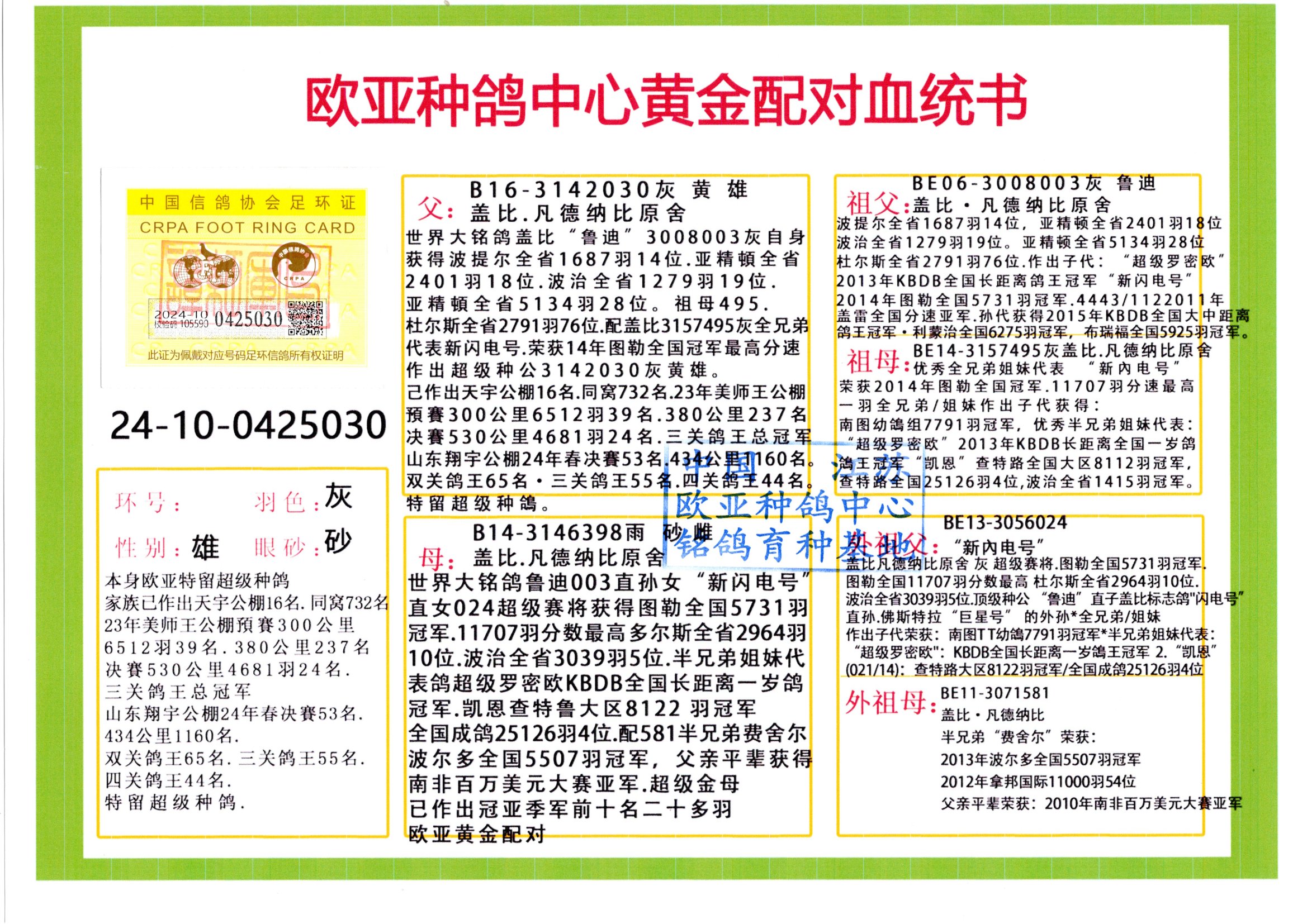 24年秋南京特比環(huán)歐亞榮獲大團(tuán)體冠軍.小團(tuán)體冠軍551公里大特比13名.14名.16名.19名.20名.21名.24名.26名.27名.28名.42名.52名.54名.57名.65名.66名.68名.70名.71名.72名.74名.76名.80名.82名.83名.84名.85名.86名.90名.92名.110名.116名.121名.122名.128名.131名.158名.161名.164名.165名.166名.172名.174名.177名.182名.195名.196名.201名.205名.208名.210名.216名.253名.269名.275名.276名.294名.296名.299名,,24年秋云南天南銅都公棚決賽415名.天南銅都小棚決賽409名.云南玉活公棚決賽102名.490名.團(tuán)體32名上籠二羽進(jìn)二羽,天南銅都大棚506公里決賽445名。熱烈祝賀河北省巨鹿縣李蘭生老師用歐亞泰山號(hào)血系連續(xù)十一年奪冠軍,河北省國(guó)家賽冠軍.全國(guó)季軍等多次前十名高位,揚(yáng)州王軍王總用歐亞利奧24年春季獲山東翔宇公棚決賽33名蓋比53名。南京劉正龍劉總用歐亞蓋比獲得24年秋山東濰坊國(guó)際公棚決賽42名.精英賽30名.三關(guān)鴿王71名.決賽86名.加站賽16名.南京市特比環(huán)A組鴿王9名.B組鴿王5名.6名.C組鴿王5名.精英賽冠軍4名.技能賽A組冠軍4名.5名.秦淮區(qū)特比環(huán)榮獲15名.46名.48名.87名。四川西昌徐亮徐總用歐亞利奧獲得涼山州聚友決賽177名.第二關(guān)亞軍雙關(guān)鴿王19名.三關(guān)鴿王105名.云南豪庭公棚決賽603名。熱烈祝賀24年四川重慶翔園鴿舍用歐亞泰山號(hào)榮獲春季400公里冠軍.秋季500公里冠軍,河北王總用詹森X利奧獲得千羽千翔公棚400公里冠軍,廣東蔡楷煥榮獲24年秋愛好者 賽鴿俱樂部三關(guān)鴿王季軍.一關(guān)420公里99名.二關(guān)450公里11名.三關(guān)520公里32名.單關(guān)季軍.7名.12名,江西李衛(wèi)興榮獲貴州紅楓公棚8名.共翔俱樂部寄養(yǎng)棚四關(guān)綜合鴿王30名.一關(guān)400公里78名.二關(guān)500公里55名.三關(guān)520公里37名.四關(guān)500公里57名.同父母獲公棚18名.雷鳴獲得武漢黃浦育翔中心冠軍,四川陳文獲得四川明鴻俱樂部300公里夢(mèng)幻2名.3名.4名.9名.10名.13名.14名.15名.31名.34名.40名.41名.42名.43名.69名.71名.72名.73名.74名.94名.95名.97名.98名.99名.419公里決賽榮獲總冠軍7名.總共歸巢9羽,四川徐亮獲豪庭決賽603名,山西鄭勇獲得山西泰鑫公棚決賽255名詹森紅狐,熱烈祝賀馬總獲得開爾(飛躍隊(duì))決賽9名獲獎(jiǎng)金1310000萬元.第一關(guān)52名,天津津福資賽180公里96名.獲獎(jiǎng)金429543萬元,歐亞支持全國(guó)鴿友24年秋多人報(bào)喜 祝大家取得更好成績(jī),給歐亞報(bào)喜鴿友歐亞決定給每人贈(zèng)送一羽超級(jí)種鴿。歐亞俱樂部特比環(huán)多關(guān)鴿王成績(jī):15年秋淮安特比環(huán)黑色星期一全會(huì)上籠9700多羽,當(dāng)天無鴿歸巢,第二天全會(huì)歸巢357羽,本舍歸巢158羽.前十名八羽.前一百名歸巢57羽,16年春季獲五關(guān)鴿王總冠軍,總亞軍四名.六名.七名.九名.十名.晶藝俱樂部520公里冠亞季軍5名.6名.7名.9名.11名等,火車頭冠軍.季軍6名.8名.9名.10名,16年秋晶藝俱樂部特比環(huán)520公里亞軍.季軍4名.6名.7名.9名,15年春南京白下特比環(huán)冠軍.亞軍.季軍6名.7名.8名.9名.10名.指定鴿A B組獲得冠軍.亞軍.季軍4名.5名.,17年淮安特比環(huán)亞軍.4名.5名.7名.8名.10名.六關(guān)鴿王總冠軍.4名.6名.9名.10名,寄養(yǎng)棚宿遷劉總20羽特比環(huán)獲冠軍.季軍.4名.7名.8名.9名等。18年榮獲萬羽特比環(huán)六關(guān)鴿王總冠軍.總亞軍.總季軍.6名.8名.十名.單關(guān)四羽冠軍.二羽亞軍.四羽季軍.前十名27羽。19年秋萬羽特比環(huán)六關(guān)鴿王總亞軍.總季軍.5名.8名等,單關(guān)二羽冠軍.三羽亞軍.一羽季軍前十名31羽。20年秋淮安市鴿會(huì)四關(guān)特比環(huán)大賽風(fēng)雨無阻鴿王亞軍.鴿王六名,金品俱樂部萬羽特比環(huán)六關(guān)鴿王總冠軍,總亞軍.四名.五名.六名.七名.八名.十名.前二百名鴿王35羽,單關(guān)冠亞季軍前十名四十多羽,火車頭五關(guān)鴿王季軍.六名.八名.前二百名鴿王十七羽。20年春榮獲淮安五區(qū)一市四關(guān)鴿王總冠軍.亞軍.四名.八名.九名。21年秋榮獲金品萬羽特比環(huán)大賽六關(guān)鴿王總亞軍.總季軍.四名.七名.九名.十名.單關(guān)冠亞軍季軍前十名三十多羽;疖囶^協(xié)會(huì)鴿王六名.七名.十名.單關(guān)前十名十七羽。22年秋榮獲鴿王總冠軍.總亞軍.5名.7名.8名.9名.11名.單關(guān)冠亞季軍前十名三十多羽,第一關(guān)單關(guān)前二百名四十多羽,第二關(guān)前二百名三十多羽,第三關(guān)前二百名四十多羽,第四關(guān)前二百名四十多羽,第五關(guān)前一百名53羽。23年秋榮獲鴿王季軍.五名.八名.十名.13名.17名.20名.27名等多羽鴿王.單關(guān)前十名二十多羽。公棚.寄養(yǎng)棚部分成績(jī):16年秋寧夏黃河公棚總冠軍電腦戈馬力指定通炮冠軍,17年送八羽參賽獲得鴿王八名進(jìn)獎(jiǎng)四名,支持韓總榮獲八名。支持鴿友榮獲寧夏中衛(wèi)公棚決賽總冠軍.精英賽冠軍,支持18年寧夏黃河公棚決賽冠軍詹森X泰山。安徽鼎博寄養(yǎng)棚院內(nèi)外四關(guān)鴿王總冠軍.鴿王十七名.三十七名同窩,鴿王39名.42名.58名.67名。18年山東公棚預(yù)賽冠軍.決賽65名.送八羽進(jìn)獎(jiǎng)五羽.指定獲奔馳汽車一輛。支持鴿友獲得云南藍(lán)云公棚冠軍.蓋比X佛卡門。支持鴿友榮獲云南銀集公棚決賽冠軍 詹森427X520血系 速度賽6700羽冠軍。17年榮獲金馬俱樂部寄養(y