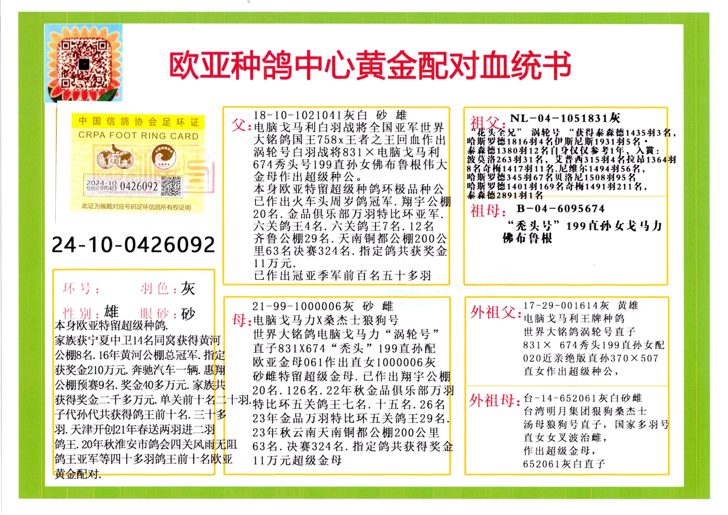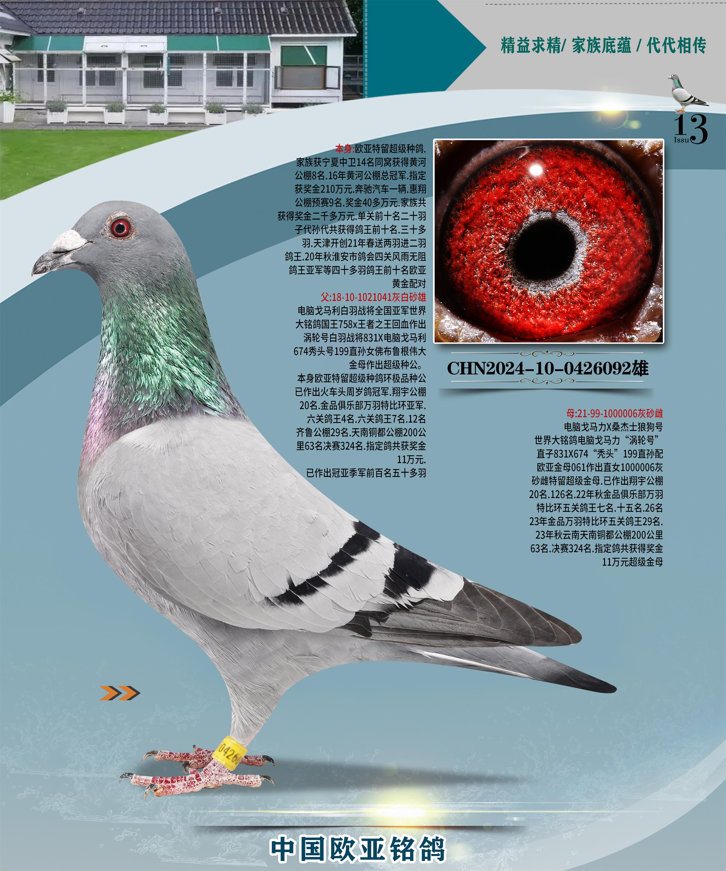 24年秋南京特比環(huán)歐亞榮獲大團體冠軍.小團體冠軍551公里大特比13名.14名.16名.19名.20名.21名.24名.26名.27名.28名.42名.52名.54名.57名.65名.66名.68名.70名.71名.72名.74名.76名.80名.82名.83名.84名.85名.86名.90名.92名.110名.116名.121名.122名.128名.131名.158名.161名.164名.165名.166名.172名.174名.177名.182名.195名.196名.201名.205名.208名.210名.216名.253名.269名.275名.276名.294名.296名.299名,,24年秋云南天南銅都公棚決賽415名.天南銅都小棚決賽409名.云南玉活公棚決賽102名.490名.團體32名上籠二羽進二羽,天南銅都大棚506公里決賽445名。熱烈祝賀河北省巨鹿縣李蘭生老師用歐亞泰山號血系連續(xù)十一年奪冠軍,河北省國家賽冠軍.全國季軍等多次前十名高位,揚州王軍王總用歐亞利奧24年春季獲山東翔宇公棚決賽33名蓋比53名。南京劉正龍劉總用歐亞蓋比獲得24年秋山東濰坊國際公棚決賽42名.精英賽30名.三關鴿王71名.決賽86名.加站賽16名.南京市特比環(huán)A組鴿王9名.B組鴿王5名.6名.C組鴿王5名.精英賽冠軍4名.技能賽A組冠軍4名.5名.秦淮區(qū)特比環(huán)榮獲15名.46名.48名.87名。四川西昌徐亮徐總用歐亞利奧獲得涼山州聚友決賽177名.第二關亞軍雙關鴿王19名.三關鴿王105名.云南豪庭公棚決賽603名。熱烈祝賀24年四川重慶翔園鴿舍用歐亞泰山號榮獲春季400公里冠軍.秋季500公里冠軍,河北王總用詹森X利奧獲得千羽千翔公棚400公里冠軍,廣東蔡楷煥榮獲24年秋愛好者 賽鴿俱樂部三關鴿王季軍.一關420公里99名.二關450公里11名.三關520公里32名.單關季軍.7名.12名,江西李衛(wèi)興榮獲貴州紅楓公棚8名.共翔俱樂部寄養(yǎng)棚四關綜合鴿王30名.一關400公里78名.二關500公里55名.三關520公里37名.四關500公里57名.同父母獲公棚18名.雷鳴獲得武漢黃浦育翔中心冠軍,四川陳文獲得四川明鴻俱樂部300公里夢幻2名.3名.4名.9名.10名.13名.14名.15名.31名.34名.40名.41名.42名.43名.69名.71名.72名.73名.74名.94名.95名.97名.98名.99名.419公里決賽榮獲總冠軍7名.總共歸巢9羽,四川徐亮獲豪庭決賽603名,山西鄭勇獲得山西泰鑫公棚決賽255名詹森紅狐,熱烈祝賀馬總獲得開爾(飛躍隊)決賽9名獲獎金1310000萬元.第一關52名,天津津福資賽180公里96名.獲獎金429543萬元,歐亞支持全國鴿友24年秋多人報喜 祝大家取得更好成績,給歐亞報喜鴿友歐亞決定給每人贈送一羽超級種鴿。歐亞俱樂部特比環(huán)多關鴿王成績:15年秋淮安特比環(huán)黑色星期一全會上籠9700多羽,當天無鴿歸巢,第二天全會歸巢357羽,本舍歸巢158羽.前十名八羽.前一百名歸巢57羽,16年春季獲五關鴿王總冠軍,總亞軍四名.六名.七名.九名.十名.晶藝俱樂部520公里冠亞季軍5名.6名.7名.9名.11名等,火車頭冠軍.季軍6名.8名.9名.10名,16年秋晶藝俱樂部特比環(huán)520公里亞軍.季軍4名.6名.7名.9名,15年春南京白下特比環(huán)冠軍.亞軍.季軍6名.7名.8名.9名.10名.指定鴿A B組獲得冠軍.亞軍.季軍4名.5名.,17年淮安特比環(huán)亞軍.4名.5名.7名.8名.10名.六關鴿王總冠軍.4名.6名.9名.10名,寄養(yǎng)棚宿遷劉總20羽特比環(huán)獲冠軍.季軍.4名.7名.8名.9名等。18年榮獲萬羽特比環(huán)六關鴿王總冠軍.總亞軍.總季軍.6名.8名.十名.單關四羽冠軍.二羽亞軍.四羽季軍.前十名27羽。19年秋萬羽特比環(huán)六關鴿王總亞軍.總季軍.5名.8名等,單關二羽冠軍.三羽亞軍.一羽季軍前十名31羽。20年秋淮安市鴿會四關特比環(huán)大賽風雨無阻鴿王亞軍.鴿王六名,金品俱樂部萬羽特比環(huán)六關鴿王總冠軍,總亞軍.四名.五名.六名.七名.八名.十名.前二百名鴿王35羽,單關冠亞季軍前十名四十多羽,火車頭五關鴿王季軍.六名.八名.前二百名鴿王十七羽。20年春榮獲淮安五區(qū)一市四關鴿王總冠軍.亞軍.四名.八名.九名。21年秋榮獲金品萬羽特比環(huán)大賽六關鴿王總亞軍.總季軍.四名.七名.九名.十名.單關冠亞軍季軍前十名三十多羽;疖囶^協(xié)會鴿王六名.七名.十名.單關前十名十七羽。22年秋榮獲鴿王總冠軍.總亞軍.5名.7名.8名.9名.11名.單關冠亞季軍前十名三十多羽,第一關單關前二百名四十多羽,第二關前二百名三十多羽,第三關前二百名四十多羽,第四關前二百名四十多羽,第五關前一百名53羽。23年秋榮獲鴿王季軍.五名.八名.十名.13名.17名.20名.27名等多羽鴿王.單關前十名二十多羽。公棚.寄養(yǎng)棚部分成績:16年秋寧夏黃河公棚總冠軍電腦戈馬力指定通炮冠軍,17年送八羽參賽獲得鴿王八名進獎四名,支持韓總榮獲八名。支持鴿友榮獲寧夏中衛(wèi)公棚決賽總冠軍.精英賽冠軍,支持18年寧夏黃河公棚決賽冠軍詹森X泰山。安徽鼎博寄養(yǎng)棚院內(nèi)外四關鴿王總冠軍.鴿王十七名.三十七名同窩,鴿王39名.42名.58名.67名。18年山東公棚預賽冠軍.決賽65名.送八羽進獎五羽.指定獲奔馳汽車一輛。支持鴿友獲得云南藍云公棚冠軍.蓋比X佛卡門。支持鴿友榮獲云南銀集公棚決賽冠軍 詹森427X520血系 速度賽6700羽冠軍。17年榮獲金馬俱樂部寄養(yǎng)棚四關鴿王總冠軍.季軍.六名.八名.第一關冠軍.亞軍.季軍四名.七名.十一名.金牌教練獎。支持鴿友18年北京費翔公棚預賽九名電腦X桑杰士,支持鴿友榮獲陜西威力公棚決賽11名.內(nèi)蒙古臨河寄養(yǎng)棚四關鴿王六名.詹森配泰山,支持河北王總用歐亞詹森427配胡本喜獲20年秋開爾青年棚季軍。云南東榮公棚16年預賽冠軍.決賽77名.17年決賽12名.詹森紅狐X泰山,17年平安公