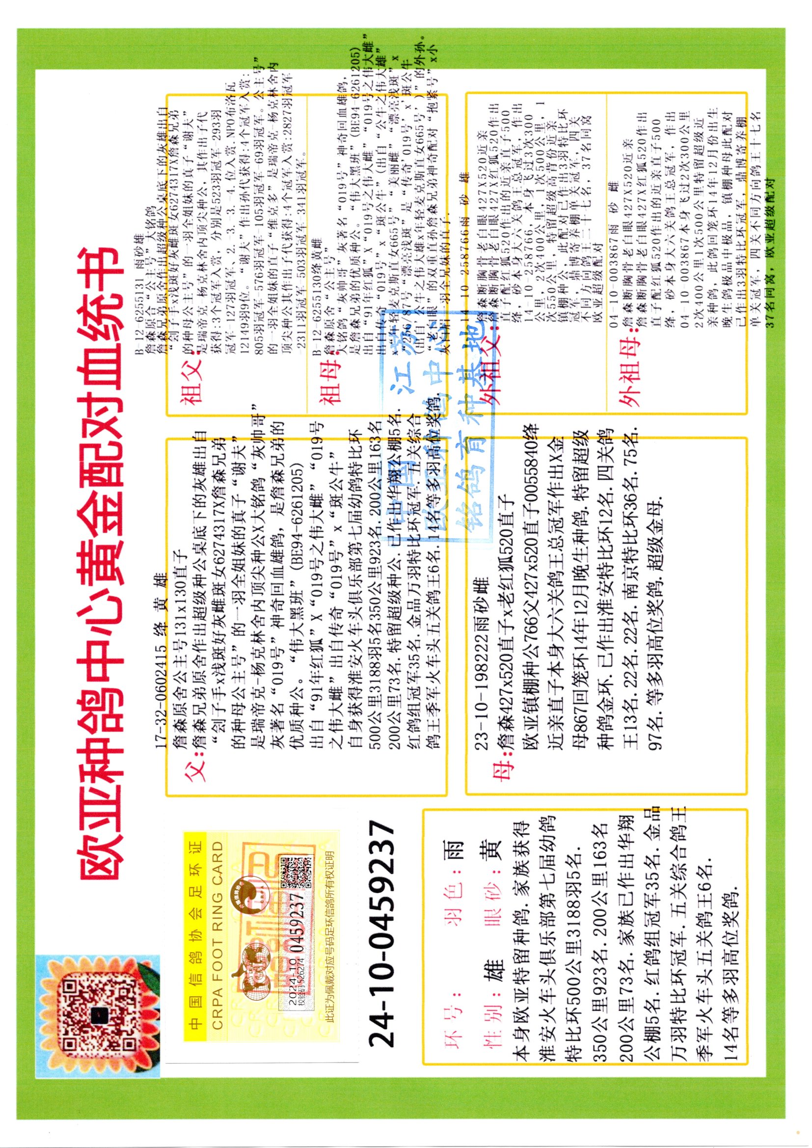24年秋南京特比環(huán)歐亞榮獲大團(tuán)體冠軍.小團(tuán)體冠軍551公里大特比13名.14名.16名.19名.20名.21名.24名.26名.27名.28名.42名.52名.54名.57名.65名.66名.68名.70名.71名.72名.74名.76名.80名.82名.83名.84名.85名.86名.90名.92名.110名.116名.121名.122名.128名.131名.158名.161名.164名.165名.166名.172名.174名.177名.182名.195名.196名.201名.205名.208名.210名.216名.253名.269名.275名.276名.294名.296名.299名,,24年秋云南天南銅都公棚決賽415名.天南銅都小棚決賽409名.云南玉活公棚決賽102名.490名.團(tuán)體32名上籠二羽進(jìn)二羽,天南銅都大棚506公里決賽445名。熱烈祝賀河北省巨鹿縣李蘭生老師用歐亞泰山號(hào)血系連續(xù)十一年奪冠軍,河北省國家賽冠軍.全國季軍等多次前十名高位,揚(yáng)州王軍王總用歐亞利奧24年春季獲山東翔宇公棚決賽33名蓋比53名。南京劉正龍劉總用歐亞蓋比獲得24年秋山東濰坊國際公棚決賽42名.精英賽30名.三關(guān)鴿王71名.決賽86名.加站賽16名.南京市特比環(huán)A組鴿王9名.B組鴿王5名.6名.C組鴿王5名.精英賽冠軍4名.技能賽A組冠軍4名.5名.秦淮區(qū)特比環(huán)榮獲15名.46名.48名.87名。四川西昌徐亮徐總用歐亞利奧獲得涼山州聚友決賽177名.第二關(guān)亞軍雙關(guān)鴿王19名.三關(guān)鴿王105名.云南豪庭公棚決賽603名。熱烈祝賀24年四川重慶翔園鴿舍用歐亞泰山號(hào)榮獲春季400公里冠軍.秋季500公里冠軍,河北王總用詹森X利奧獲得千羽千翔公棚400公里冠軍,廣東蔡楷煥榮獲24年秋愛好者 賽鴿俱樂部三關(guān)鴿王季軍.一關(guān)420公里99名.二關(guān)450公里11名.三關(guān)520公里32名.單關(guān)季軍.7名.12名,江西李衛(wèi)興榮獲貴州紅楓公棚8名.共翔俱樂部寄養(yǎng)棚四關(guān)綜合鴿王30名.一關(guān)400公里78名.二關(guān)500公里55名.三關(guān)520公里37名.四關(guān)500公里57名.同父母獲公棚18名.雷鳴獲得武漢黃浦育翔中心冠軍,四川陳文獲得四川明鴻俱樂部300公里夢(mèng)幻2名.3名.4名.9名.10名.13名.14名.15名.31名.34名.40名.41名.42名.43名.69名.71名.72名.73名.74名.94名.95名.97名.98名.99名.419公里決賽榮獲總冠軍7名.總共歸巢9羽,四川徐亮獲豪庭決賽603名,山西鄭勇獲得山西泰鑫公棚決賽255名詹森紅狐,熱烈祝賀馬總獲得開爾(飛躍隊(duì))決賽9名獲獎(jiǎng)金1310000萬元.第一關(guān)52名,天津津福資賽180公里96名.獲獎(jiǎng)金429543萬元,歐亞支持全國鴿友24年秋多人報(bào)喜 祝大家取得更好成績,給歐亞報(bào)喜鴿友歐亞決定給每人贈(zèng)送一羽超級(jí)種鴿。歐亞俱樂部特比環(huán)多關(guān)鴿王成績:15年秋淮安特比環(huán)黑色星期一全會(huì)上籠9700多羽,當(dāng)天無鴿歸巢,第二天全會(huì)歸巢357羽,本舍歸巢158羽.前十名八羽.前一百名歸巢57羽,16年春季獲五關(guān)鴿王總冠軍,總亞軍四名.六名.七名.九名.十名.晶藝俱樂部520公里冠亞季軍5名.6名.7名.9名.11名等,火車頭冠軍.季軍6名.8名.9名.10名,16年秋晶藝俱樂部特比環(huán)520公里亞軍.季軍4名.6名.7名.9名,15年春南京白下特比環(huán)冠軍.亞軍.季軍6名.7名.8名.9名.10名.指定鴿A B組獲得冠軍.亞軍.季軍4名.5名.,17年淮安特比環(huán)亞軍.4名.5名.7名.8名.10名.六關(guān)鴿王總冠軍.4名.6名.9名.10名,寄養(yǎng)棚宿遷劉總20羽特比環(huán)獲冠軍.季軍.4名.7名.8名.9名等。18年榮獲萬羽特比環(huán)六關(guān)鴿王總冠軍.總亞軍.總季軍.6名.8名.十名.單關(guān)四羽冠軍.二羽亞軍.四羽季軍.前十名27羽。19年秋萬羽特比環(huán)六關(guān)鴿王總亞軍.總季軍.5名.8名等,單關(guān)二羽冠軍.三羽亞軍.一羽季軍前十名31羽。20年秋淮安市鴿會(huì)四關(guān)特比環(huán)大賽風(fēng)雨無阻鴿王亞軍.鴿王六名,金品俱樂部萬羽特比環(huán)六關(guān)鴿王總冠軍,總亞軍.四名.五名.六名.七名.八名.十名.前二百名鴿王35羽,單關(guān)冠亞季軍前十名四十多羽,火車頭五關(guān)鴿王季軍.六名.八名.前二百名鴿王十七羽。20年春榮獲淮安五區(qū)一市四關(guān)鴿王總冠軍.亞軍.四名.八名.九名。21年秋榮獲金品萬羽特比環(huán)大賽六關(guān)鴿王總亞軍.總季軍.四名.七名.九名.十名.單關(guān)冠亞軍季軍前十名三十多羽;疖囶^協(xié)會(huì)鴿王六名.七名.十名.單關(guān)前十名十七羽。22年秋榮獲鴿王總冠軍.總亞軍.5名.7名.8名.9名.11名.單關(guān)冠亞季軍前十名三十多羽,第一關(guān)單關(guān)前二百名四十多羽,第二關(guān)前二百名三十多羽,第三關(guān)前二百名四十多羽,第四關(guān)前二百名四十多羽,第五關(guān)前一百名53羽。23年秋榮獲鴿王季軍.五名.八名.十名.13名.17名.20名.27名等多羽鴿王.單關(guān)前十名二十多羽。公棚.寄養(yǎng)棚部分成績:16年秋寧夏黃河公棚總冠軍電腦戈馬力指定通炮冠軍,17年送八羽參賽獲得鴿王八名進(jìn)獎(jiǎng)四名,支持韓總榮獲八名。支持鴿友榮獲寧夏中衛(wèi)公棚決賽總冠軍.精英賽冠軍,支持18年寧夏黃河公棚決賽冠軍詹森X泰山。安徽鼎博寄養(yǎng)棚院內(nèi)外四關(guān)鴿王總冠軍.鴿王十七名.三十七名同窩,鴿王39名.42名.58名.67名。18年山東公棚預(yù)賽冠軍.決賽65名.送八羽進(jìn)獎(jiǎng)五羽.指定獲奔馳汽車一輛。支持鴿友獲得云南藍(lán)云公棚冠軍.蓋比X佛卡門。支持鴿友榮獲云南銀集公棚決賽冠軍 詹森427X520血系 速度賽6700羽冠軍。17年榮獲金馬俱樂部寄養(yǎng)棚四關(guān)鴿王總冠軍.季