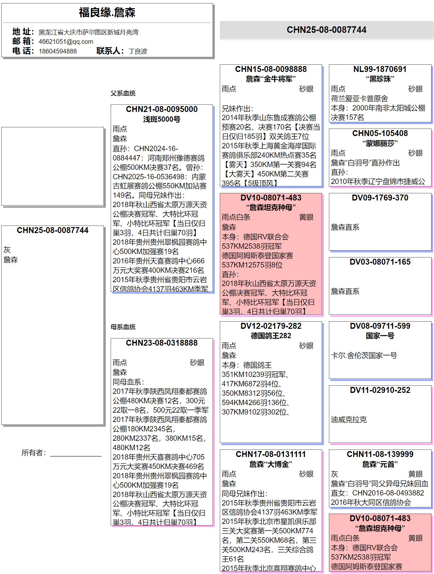本身:德國鴿王351KM10239羽冠軍、417KM6872羽4位、350KM8312羽56位、594KM4266羽136位、307KM9102羽302位、