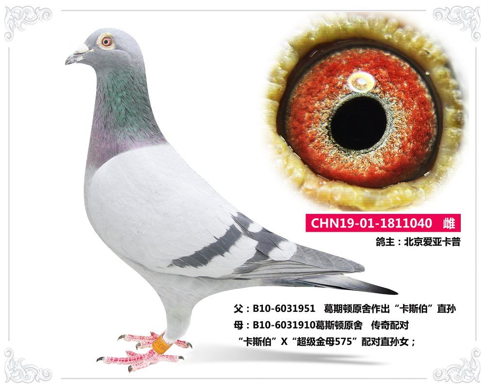 父:B10-6031951 葛期頓原舍作出“卡斯伯”直孫 父親平輩獲得:安特衛(wèi)普俱樂部長距離鴿王 子代獲得:14年北戴河金友賽鴿俱樂部第一關(guān)400公里58名;第二關(guān)400公里210名;第三關(guān)500公里26名;第四關(guān)500公里500名;三關(guān)綜合31名;16年河北唐山銀水賽鴿公棚500公里決賽320名