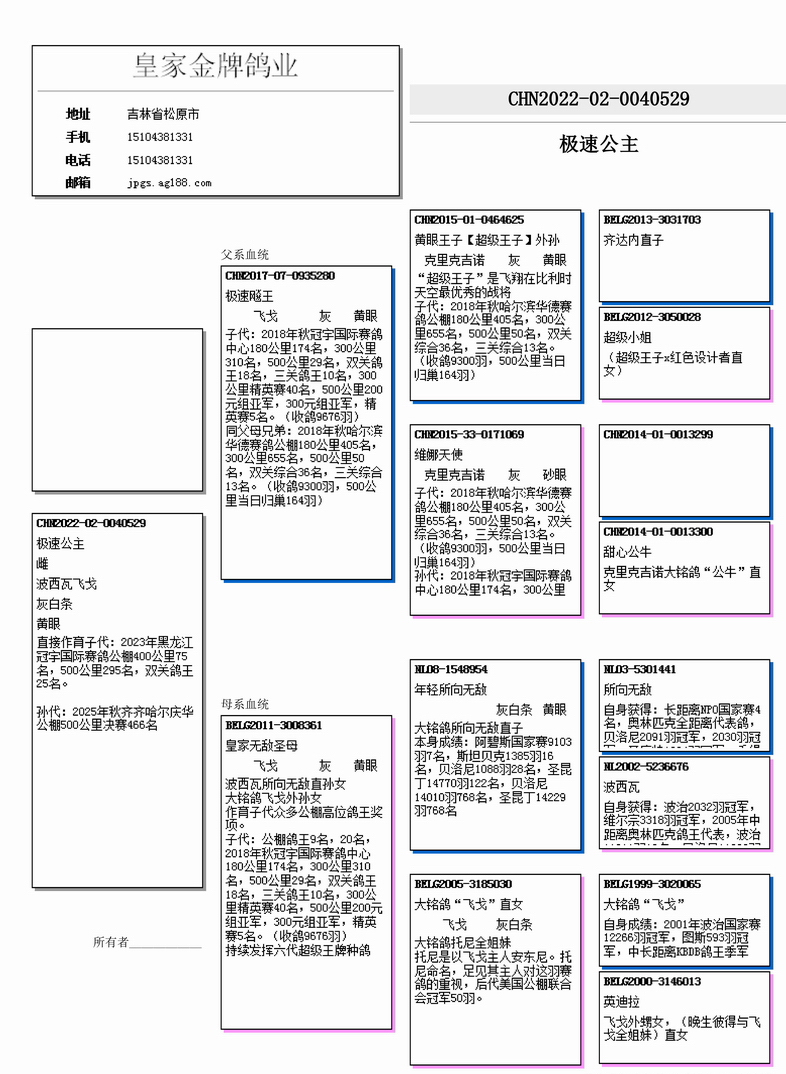 作育子代眾多公棚高位鴿王獎(jiǎng)項(xiàng)。