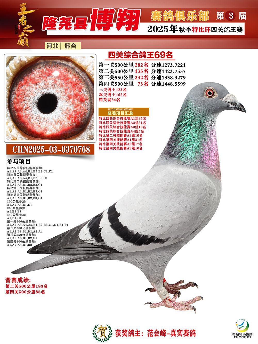 | 1626219 | 博翔特比四關(guān)鴿王冠軍 | ¥1600元 | 4次 |