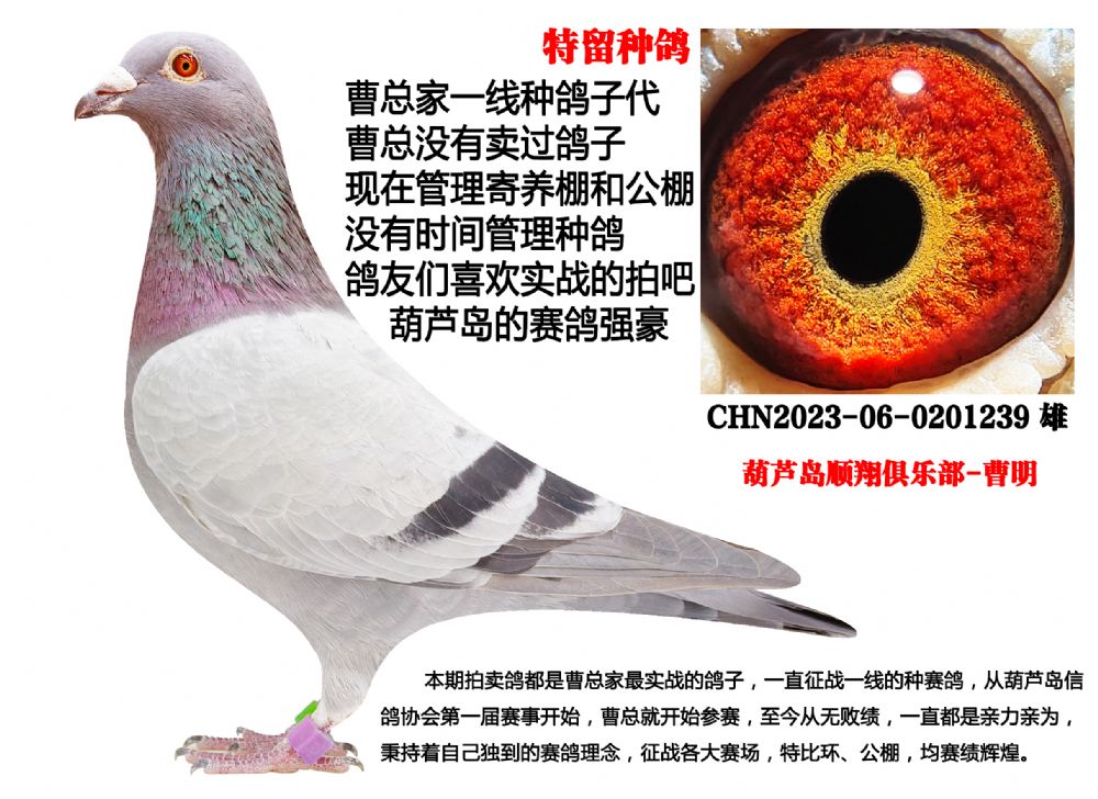本期拍賣鴿都是曹總家的最實戰(zhàn)鴿子,一直征戰(zhàn)在一線的種賽鴿,曹總從葫蘆島市信鴿協(xié)會第一屆開始就參賽,至今從無敗績,公棚也是如魚得水,屢戰(zhàn)屢勝,曹總養(yǎng)鴿一直都是親力親為,秉持著自己獨到的賽鴿理念,征戰(zhàn)在全國各大賽場,戰(zhàn)績輝煌。