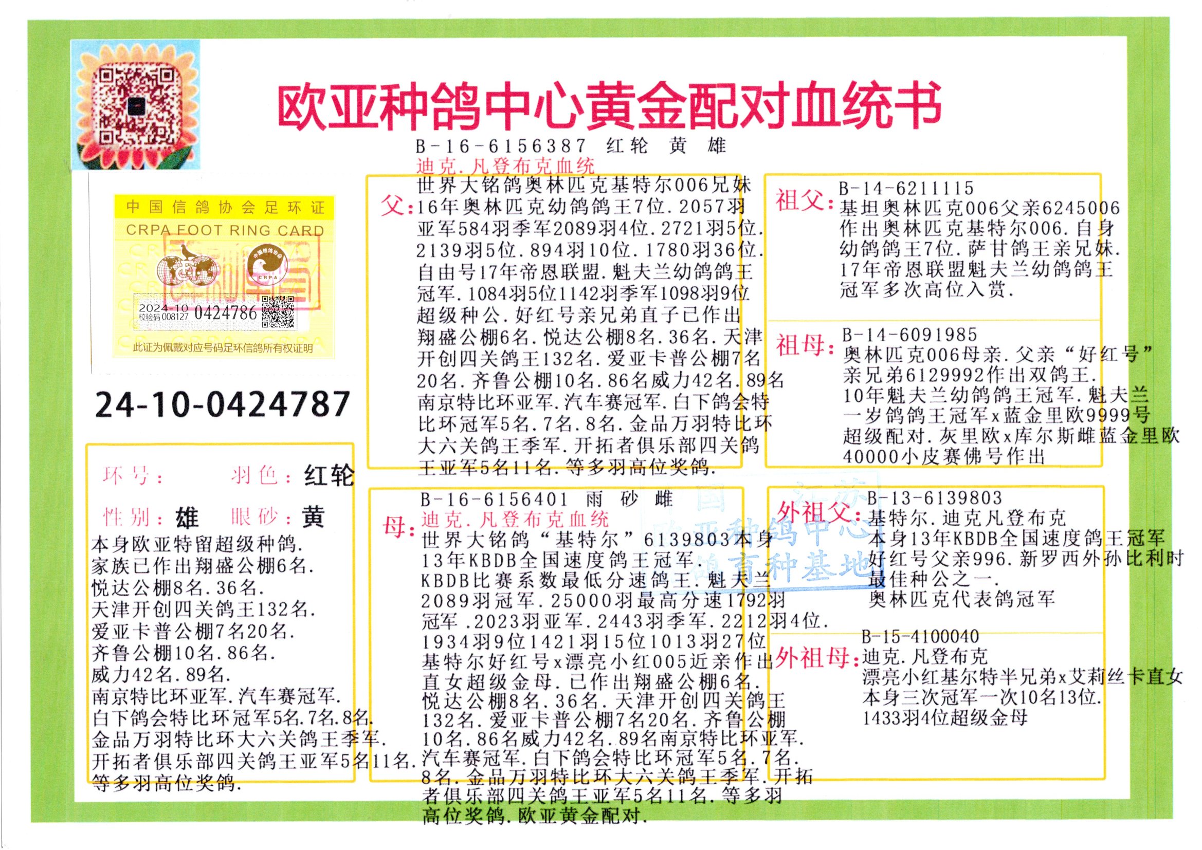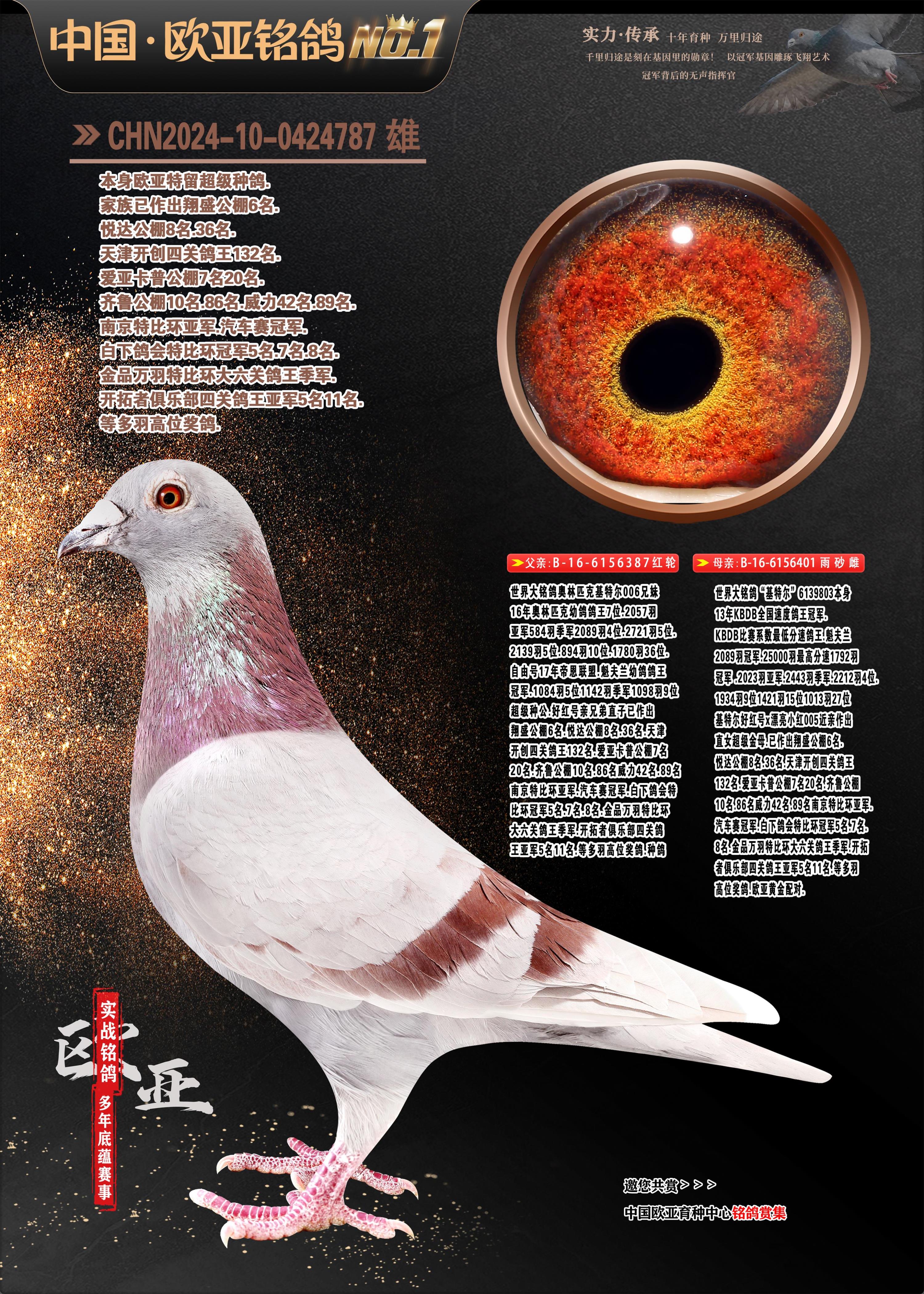 24年秋南京特比環(huán)歐亞榮獲大團(tuán)體冠軍.小團(tuán)體冠軍551公里大特比13名.14名.16名.19名.20名.21名.24名.26名.27名.28名.42名.52名.54名.57名.65名.66名.68名.70名.71名.72名.74名.76名.80名.82名.83名.84名.85名.86名.90名.92名.110名.116名.121名.122名.128名.131名.158名.161名.164名.165名.166名.172名.174名.177名.182名.195名.196名.201名.205名.208名.210名.216名.253名.269名.275名.276名.294名.296名.299名,,24年秋云南天南銅都公棚決賽415名.天南銅都小棚決賽409名.云南玉活公棚決賽102名.490名.團(tuán)體32名上籠二羽進(jìn)二羽,天南銅都大棚506公里決賽445名。熱烈祝賀河北省巨鹿縣李蘭生老師用歐亞泰山號(hào)血系連續(xù)十一年奪冠軍,河北省國家賽冠軍.全國季軍等多次前十名高位,揚(yáng)州王軍王總用歐亞利奧24年春季獲山東翔宇公棚決賽33名蓋比53名。南京劉正龍劉總用歐亞蓋比獲得24年秋山東濰坊國際公棚決賽42名.精英賽30名.三關(guān)鴿王71名.決賽86名.加站賽16名.南京市特比環(huán)A組鴿王9名.B組鴿王5名.6名.C組鴿王5名.精英賽冠軍4名.技能賽A組冠軍4名.5名.秦淮區(qū)特比環(huán)榮獲15名.46名.48名.87名。四川西昌徐亮徐總用歐亞利奧獲得涼山州聚友決賽177名.第二關(guān)亞軍雙關(guān)鴿王19名.三關(guān)鴿王105名.云南豪庭公棚決賽603名。熱烈祝賀24年四川重慶翔園鴿舍用歐亞泰山號(hào)榮獲春季400公里冠軍.秋季500公里冠軍,河北王總用詹森X利奧獲得千羽千翔公棚400公里冠軍,廣東蔡楷煥榮獲24年秋愛好者 賽鴿俱樂部三關(guān)鴿王季軍.一關(guān)420公里99名.二關(guān)450公里11名.三關(guān)520公里32名.單關(guān)季軍.7名.12名,江西李衛(wèi)興榮獲貴州紅楓公棚8名.共翔俱樂部寄養(yǎng)棚四關(guān)綜合鴿王30名.一關(guān)400公里78名.二關(guān)500公里55名.三關(guān)520公里37名.四關(guān)500公里57名.同父母獲公棚18名.雷鳴獲得武漢黃浦育翔中心冠軍,四川陳文獲得四川明鴻俱樂部300公里夢(mèng)幻2名.3名.4名.9名.10名.13名.14名.15名.31名.34名.40名.41名.42名.43名.69名.71名.72名.73名.74名.94名.95名.97名.98名.99名.419公里決賽榮獲總冠軍7名.總共歸巢9羽,四川徐亮獲豪庭決賽603名,山西鄭勇獲得山西泰鑫公棚決賽255名詹森紅狐,熱烈祝賀馬總獲得開爾(飛躍隊(duì))決賽9名獲獎(jiǎng)金1310000萬元.第一關(guān)52名,天津津福資賽180公里96名.獲獎(jiǎng)金429543萬元,歐亞支持全國鴿友24年秋多人報(bào)喜 祝大家取得更好成績(jī),給歐亞報(bào)喜鴿友歐亞決定給每人贈(zèng)送一羽超級(jí)種鴿。歐亞俱樂部特比環(huán)多關(guān)鴿王成績(jī):15年秋淮安特比環(huán)黑色星期一全會(huì)上籠9700多羽,當(dāng)天無鴿歸巢,第二天全會(huì)歸巢357羽,本舍歸巢158羽.前十名八羽.前一百名歸巢57羽,16年春季獲五關(guān)鴿王總冠軍,總亞軍四名.六名.七名.九名.十名.晶藝俱樂部520公里冠亞季軍5名.6名.7名.9名.11名等,火車頭冠軍.季軍6名.8名.9名.10名,16年秋晶藝俱樂部特比環(huán)520公里亞軍.季軍4名.6名.7名.9名,15年春南京白下特比環(huán)冠軍.亞軍.季軍6名.7名.8名.9名.10名.指定鴿A B組獲得冠軍.亞軍.季軍4名.5名.,17年淮安特比環(huán)亞軍.4名.5名.7名.8名.10名.六關(guān)鴿王總冠軍.4名.6名.9名.10名,寄養(yǎng)棚宿遷劉總20羽特比環(huán)獲冠軍.季軍.4名.7名.8名.9名等。18年榮獲萬羽特比環(huán)六關(guān)鴿王總冠軍.總亞軍.總季軍.6名.8名.十名.單關(guān)四羽冠軍.二羽亞軍.四羽季軍.前十名27羽。19年秋萬羽特比環(huán)六關(guān)鴿王總亞軍.總季軍.5名.8名等,單關(guān)二羽冠軍.三羽亞軍.一羽季軍前十名31羽。20年秋淮安市鴿會(huì)四關(guān)特比環(huán)大賽風(fēng)雨無阻鴿王亞軍.鴿王六名,金品俱樂部萬羽特比環(huán)六關(guān)鴿王總冠軍,總亞軍.四名.五名.六名.七名.八名.十名.前二百名鴿王35羽,單關(guān)冠亞季軍前十名四十多羽,火車頭五關(guān)鴿王季軍.六名.八名.前二百名鴿王十七羽。20年春榮獲淮安五區(qū)一市四關(guān)鴿王總冠軍.亞軍.四名.八名.九名。21年秋榮獲金品萬羽特比環(huán)大賽六關(guān)鴿王總亞軍.總季軍.四名.七名.九名.十名.單關(guān)冠亞軍季軍前十名三十多羽;疖囶^協(xié)會(huì)鴿王六名.七名.十名.單關(guān)前十名十七羽。22年秋榮獲鴿王總冠軍.總亞軍.5名.7名.8名.9名.11名.單關(guān)冠亞季軍前十名三十多羽,第一關(guān)單關(guān)前二百名四十多羽,第二關(guān)前二百名三十多羽,第三關(guān)前二百名四十多羽,第四關(guān)前二百名四十多羽,第五關(guān)前一百名53羽。23年秋榮獲鴿王季軍.五名.八名.十名.13名.17名.20名.27名等多羽鴿王.單關(guān)前十名二十多羽。公棚.寄養(yǎng)棚部分成績(jī):16年秋寧夏黃河公棚總冠軍電腦戈馬力指定通炮冠軍,17年送八羽參賽獲得鴿王八名進(jìn)獎(jiǎng)四名,支持韓總榮獲八名。支持鴿友榮獲寧夏中衛(wèi)公棚決賽總冠軍.精英賽冠軍,支持18年寧夏黃河公棚決賽冠軍詹森X泰山。安徽鼎博寄養(yǎng)棚院內(nèi)外四關(guān)鴿王總冠軍.鴿王十七名.三十七名同窩,鴿王39名.42名.58名.67名。18年山東公棚預(yù)賽冠軍.決賽65名.送八羽進(jìn)獎(jiǎng)五羽.指定獲奔馳汽車一輛。支持鴿友獲得云南藍(lán)云公棚冠軍.蓋比X佛卡門。支持鴿友榮獲云南銀集公棚決賽冠軍 詹森427X520血系 速度賽6700羽冠軍。17年榮獲金馬俱樂部寄養(yǎng)棚四關(guān)鴿