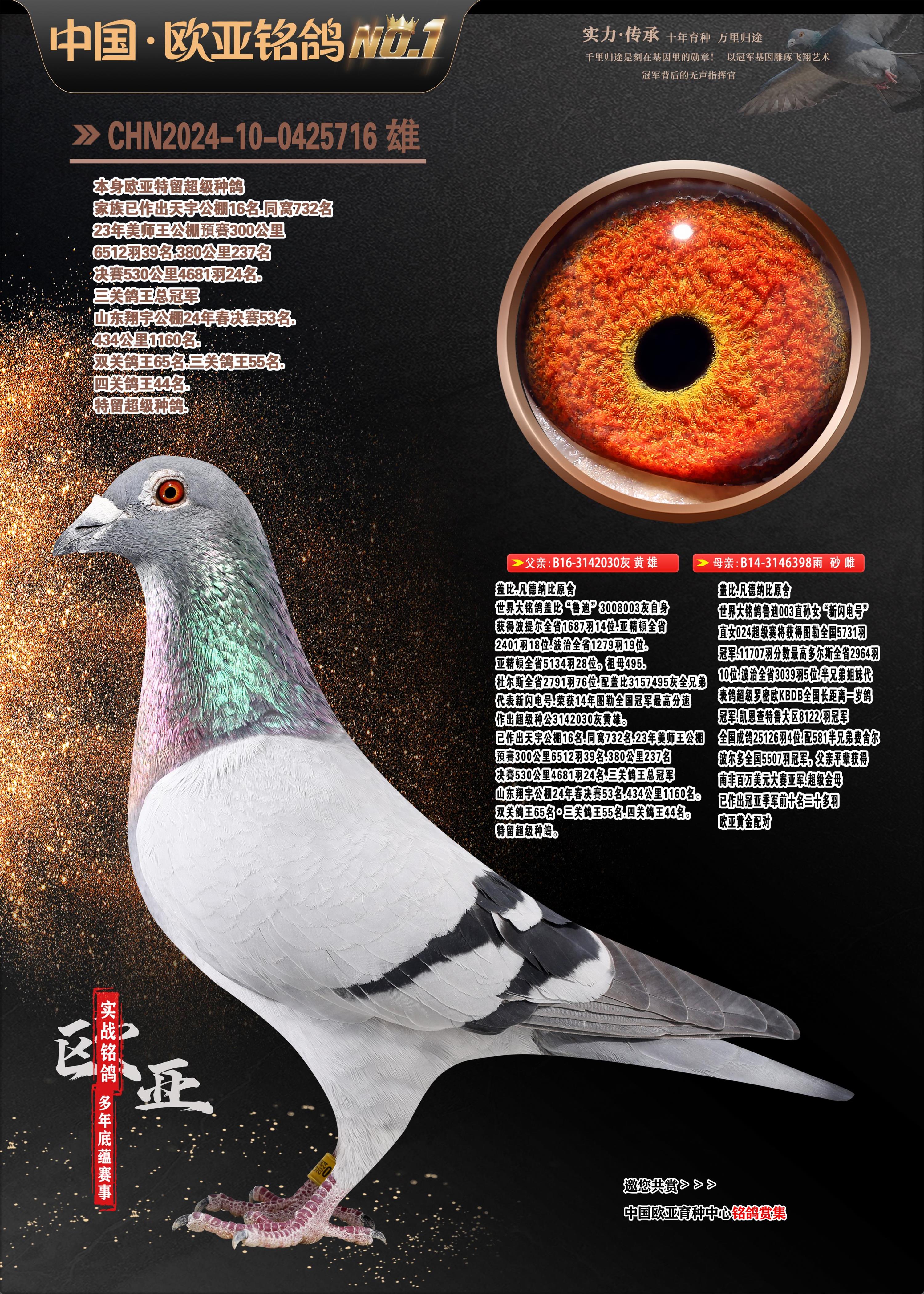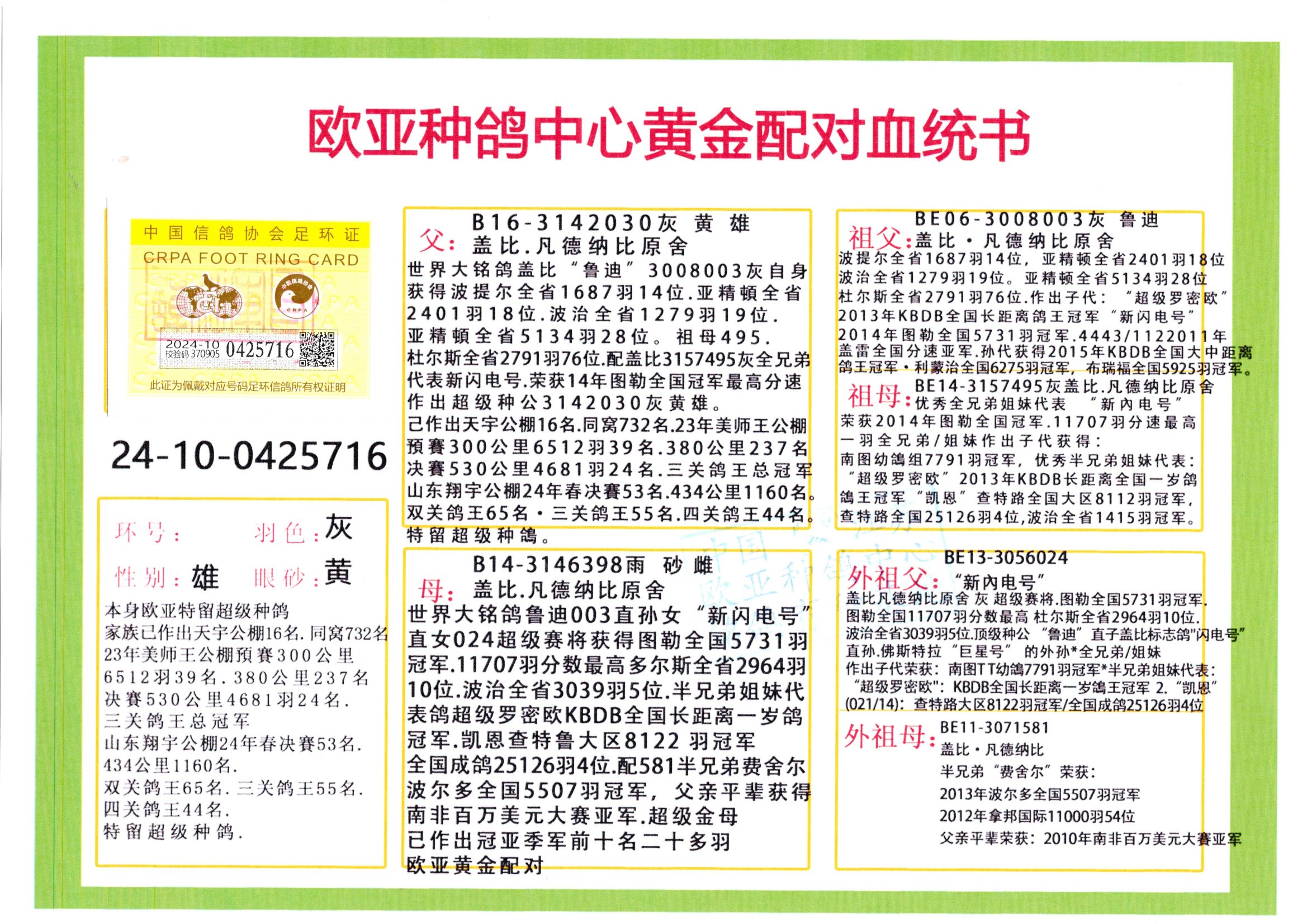 24年秋南京特比環(huán)歐亞榮獲大團(tuán)體冠軍.小團(tuán)體冠軍551公里大特比13名.14名.16名.19名.20名.21名.24名.26名.27名.28名.42名.52名.54名.57名.65名.66名.68名.70名.71名.72名.74名.76名.80名.82名.83名.84名.85名.86名.90名.92名.110名.116名.121名.122名.128名.131名.158名.161名.164名.165名.166名.172名.174名.177名.182名.195名.196名.201名.205名.208名.210名.216名.253名.269名.275名.276名.294名.296名.299名,,24年秋云南天南銅都公棚決賽415名.天南銅都小棚決賽409名.云南玉活公棚決賽102名.490名.團(tuán)體32名上籠二羽進(jìn)二羽,天南銅都大棚506公里決賽445名。熱烈祝賀河北省巨鹿縣李蘭生老師用歐亞泰山號(hào)血系連續(xù)十一年奪冠軍,河北省國(guó)家賽冠軍.全國(guó)季軍等多次前十名高位,揚(yáng)州王軍王總用歐亞利奧24年春季獲山東翔宇公棚決賽33名蓋比53名。南京劉正龍劉總用歐亞蓋比獲得24年秋山東濰坊國(guó)際公棚決賽42名.精英賽30名.三關(guān)鴿王71名.決賽86名.加站賽16名.南京市特比環(huán)A組鴿王9名.B組鴿王5名.6名.C組鴿王5名.精英賽冠軍4名.技能賽A組冠軍4名.5名.秦淮區(qū)特比環(huán)榮獲15名.46名.48名.87名。四川西昌徐亮徐總用歐亞利奧獲得涼山州聚友決賽177名.第二關(guān)亞軍雙關(guān)鴿王19名.三關(guān)鴿王105名.云南豪庭公棚決賽603名。熱烈祝賀24年四川重慶翔園鴿舍用歐亞泰山號(hào)榮獲春季400公里冠軍.秋季500公里冠軍,河北王總用詹森X利奧獲得千羽千翔公棚400公里冠軍,廣東蔡楷煥榮獲24年秋愛好者 賽鴿俱樂部三關(guān)鴿王季軍.一關(guān)420公里99名.二關(guān)450公里11名.三關(guān)520公里32名.單關(guān)季軍.7名.12名,江西李衛(wèi)興榮獲貴州紅楓公棚8名.共翔俱樂部寄養(yǎng)棚四關(guān)綜合鴿王30名.一關(guān)400公里78名.二關(guān)500公里55名.三關(guān)520公里37名.四關(guān)500公里57名.同父母獲公棚18名.雷鳴獲得武漢黃浦育翔中心冠軍,四川陳文獲得四川明鴻俱樂部300公里夢(mèng)幻2名.3名.4名.9名.10名.13名.14名.15名.31名.34名.40名.41名.42名.43名.69名.71名.72名.73名.74名.94名.95名.97名.98名.99名.419公里決賽榮獲總冠軍7名.總共歸巢9羽,四川徐亮獲豪庭決賽603名,山西鄭勇獲得山西泰鑫公棚決賽255名詹森紅狐,熱烈祝賀馬總獲得開爾(飛躍隊(duì))決賽9名獲獎(jiǎng)金1310000萬元.第一關(guān)52名,天津津福資賽180公里96名.獲獎(jiǎng)金429543萬元,歐亞支持全國(guó)鴿友24年秋多人報(bào)喜 祝大家取得更好成績(jī),給歐亞報(bào)喜鴿友歐亞決定給每人贈(zèng)送一羽超級(jí)種鴿。歐亞俱樂部特比環(huán)多關(guān)鴿王成績(jī):15年秋淮安特比環(huán)黑色星期一全會(huì)上籠9700多羽,當(dāng)天無鴿歸巢,第二天全會(huì)歸巢357羽,本舍歸巢158羽.前十名八羽.前一百名歸巢57羽,16年春季獲五關(guān)鴿王總冠軍,總亞軍四名.六名.七名.九名.十名.晶藝俱樂部520公里冠亞季軍5名.6名.7名.9名.11名等,火車頭冠軍.季軍6名.8名.9名.10名,16年秋晶藝俱樂部特比環(huán)520公里亞軍.季軍4名.6名.7名.9名,15年春南京白下特比環(huán)冠軍.亞軍.季軍6名.7名.8名.9名.10名.指定鴿A B組獲得冠軍.亞軍.季軍4名.5名.,17年淮安特比環(huán)亞軍.4名.5名.7名.8名.10名.六關(guān)鴿王總冠軍.4名.6名.9名.10名,寄養(yǎng)棚宿遷劉總20羽特比環(huán)獲冠軍.季軍.4名.7名.8名.9名等。18年榮獲萬羽特比環(huán)六關(guān)鴿王總冠軍.總亞軍.總季軍.6名.8名.十名.單關(guān)四羽冠軍.二羽亞軍.四羽季軍.前十名27羽。19年秋萬羽特比環(huán)六關(guān)鴿王總亞軍.總季軍.5名.8名等,單關(guān)二羽冠軍.三羽亞軍.一羽季軍前十名31羽。20年秋淮安市鴿會(huì)四關(guān)特比環(huán)大賽風(fēng)雨無阻鴿王亞軍.鴿王六名,金品俱樂部萬羽特比環(huán)六關(guān)鴿王總冠軍,總亞軍.四名.五名.六名.七名.八名.十名.前二百名鴿王35羽,單關(guān)冠亞季軍前十名四十多羽,火車頭五關(guān)鴿王季軍.六名.八名.前二百名鴿王十七羽。20年春榮獲淮安五區(qū)一市四關(guān)鴿王總冠軍.亞軍.四名.八名.九名。21年秋榮獲金品萬羽特比環(huán)大賽六關(guān)鴿王總亞軍.總季軍.四名.七名.九名.十名.單關(guān)冠亞軍季軍前十名三十多羽;疖囶^協(xié)會(huì)鴿王六名.七名.十名.單關(guān)前十名十七羽。22年秋榮獲鴿王總冠軍.總亞軍.5名.7名.8名.9名.11名.單關(guān)冠亞季軍前十名三十多羽,第一關(guān)單關(guān)前二百名四十多羽,第二關(guān)前二百名三十多羽,第三關(guān)前二百名四十多羽,第四關(guān)前二百名四十多羽,第五關(guān)前一百名53羽。23年秋榮獲鴿王季軍.五名.八名.十名.13名.17名.20名.27名等多羽鴿王.單關(guān)前十名二十多羽。公棚.寄養(yǎng)棚部分成績(jī):16年秋寧夏黃河公棚總冠軍電腦戈馬力指定通炮冠軍,17年送八羽參賽獲得鴿王八名進(jìn)獎(jiǎng)四名,支持韓總榮獲八名。支持鴿友榮獲寧夏中衛(wèi)公棚決賽總冠軍.精英賽冠軍,支持18年寧夏黃河公棚決賽冠軍詹森X泰山。安徽鼎博寄養(yǎng)棚院內(nèi)外四關(guān)鴿王總冠軍.鴿王十七名.三十七名同窩,鴿王39名.42名.58名.67名。18年山東公棚預(yù)賽冠軍.決賽65名.送八羽進(jìn)獎(jiǎng)五羽.指定獲奔馳汽車一輛。支持鴿友獲得云南藍(lán)云公棚冠軍.蓋比X佛卡門。支持鴿友榮獲云南銀集公棚決賽冠軍 詹森427X520血系 速度賽6700羽冠軍。17年榮獲金馬俱樂部寄養(y