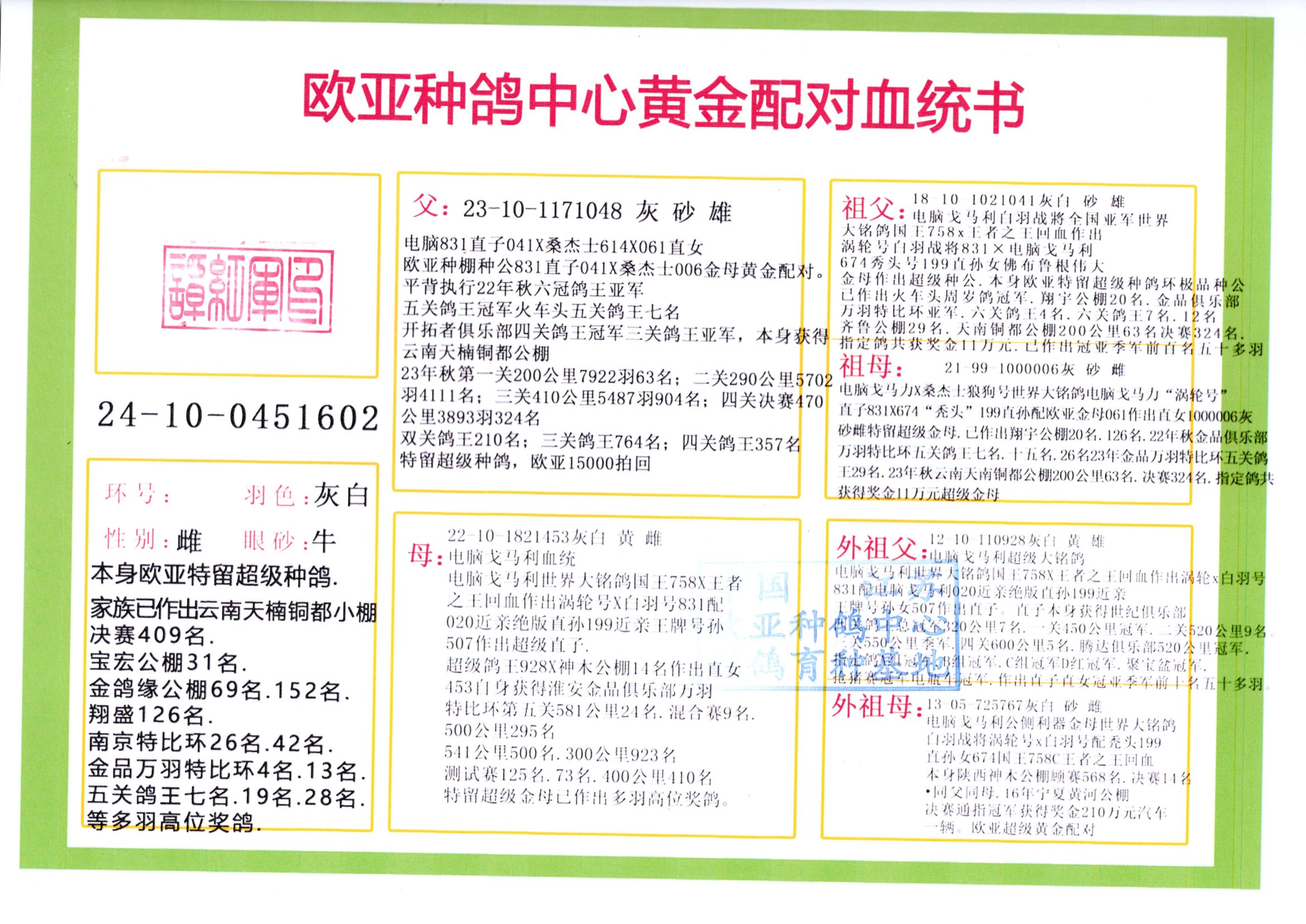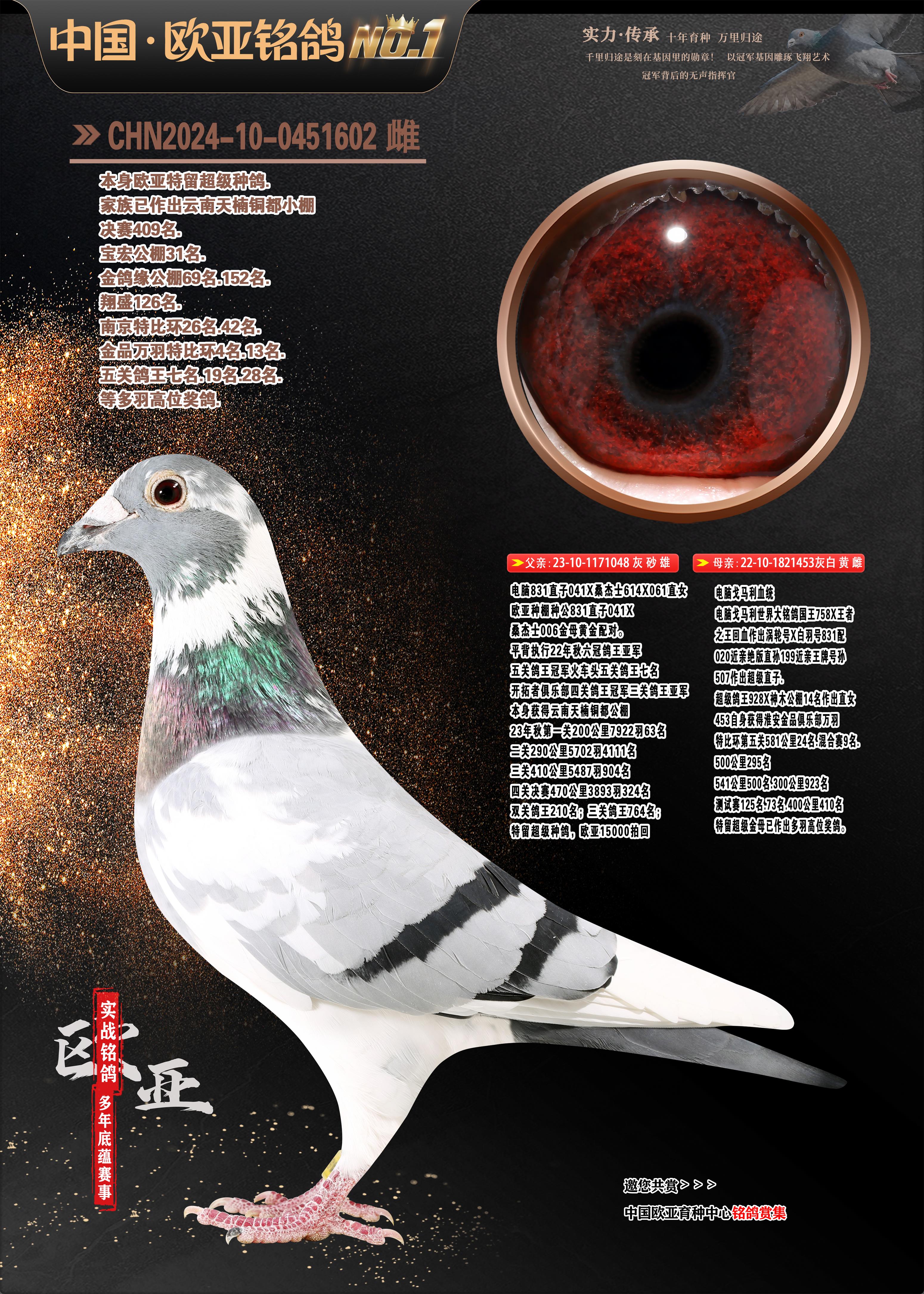 24年秋南京特比環(huán)歐亞榮獲大團(tuán)體冠軍.小團(tuán)體冠軍551公里大特比13名.14名.16名.19名.20名.21名.24名.26名.27名.28名.42名.52名.54名.57名.65名.66名.68名.70名.71名.72名.74名.76名.80名.82名.83名.84名.85名.86名.90名.92名.110名.116名.121名.122名.128名.131名.158名.161名.164名.165名.166名.172名.174名.177名.182名.195名.196名.201名.205名.208名.210名.216名.253名.269名.275名.276名.294名.296名.299名,,24年秋云南天南銅都公棚決賽415名.天南銅都小棚決賽409名.云南玉活公棚決賽102名.490名.團(tuán)體32名上籠二羽進(jìn)二羽,天南銅都大棚506公里決賽445名。熱烈祝賀河北省巨鹿縣李蘭生老師用歐亞泰山號血系連續(xù)十一年奪冠軍,河北省國家賽冠軍.全國季軍等多次前十名高位,揚(yáng)州王軍王總用歐亞利奧24年春季獲山東翔宇公棚決賽33名蓋比53名。南京劉正龍劉總用歐亞蓋比獲得24年秋山東濰坊國際公棚決賽42名.精英賽30名.三關(guān)鴿王71名.決賽86名.加站賽16名.南京市特比環(huán)A組鴿王9名.B組鴿王5名.6名.C組鴿王5名.精英賽冠軍4名.技能賽A組冠軍4名.5名.秦淮區(qū)特比環(huán)榮獲15名.46名.48名.87名。四川西昌徐亮徐總用歐亞利奧獲得涼山州聚友決賽177名.第二關(guān)亞軍雙關(guān)鴿王19名.三關(guān)鴿王105名.云南豪庭公棚決賽603名。熱烈祝賀24年四川重慶翔園鴿舍用歐亞泰山號榮獲春季400公里冠軍.秋季500公里冠軍,河北王總用詹森X利奧獲得千羽千翔公棚400公里冠軍,廣東蔡楷煥榮獲24年秋愛好者 賽鴿俱樂部三關(guān)鴿王季軍.一關(guān)420公里99名.二關(guān)450公里11名.三關(guān)520公里32名.單關(guān)季軍.7名.12名,江西李衛(wèi)興榮獲貴州紅楓公棚8名.共翔俱樂部寄養(yǎng)棚四關(guān)綜合鴿王30名.一關(guān)400公里78名.二關(guān)500公里55名.三關(guān)520公里37名.四關(guān)500公里57名.同父母獲公棚18名.雷鳴獲得武漢黃浦育翔中心冠軍,四川陳文獲得四川明鴻俱樂部300公里夢幻2名.3名.4名.9名.10名.13名.14名.15名.31名.34名.40名.41名.42名.43名.69名.71名.72名.73名.74名.94名.95名.97名.98名.99名.419公里決賽榮獲總冠軍7名.總共歸巢9羽,四川徐亮獲豪庭決賽603名,山西鄭勇獲得山西泰鑫公棚決賽255名詹森紅狐,熱烈祝賀馬總獲得開爾(飛躍隊(duì))決賽9名獲獎(jiǎng)金1310000萬元.第一關(guān)52名,天津津福資賽180公里96名.獲獎(jiǎng)金429543萬元,歐亞支持全國鴿友24年秋多人報(bào)喜 祝大家取得更好成績,給歐亞報(bào)喜鴿友歐亞決定給每人贈(zèng)送一羽超級種鴿。歐亞俱樂部特比環(huán)多關(guān)鴿王成績:15年秋淮安特比環(huán)黑色星期一全會(huì)上籠9700多羽,當(dāng)天無鴿歸巢,第二天全會(huì)歸巢357羽,本舍歸巢158羽.前十名八羽.前一百名歸巢57羽,16年春季獲五關(guān)鴿王總冠軍,總亞軍四名.六名.七名.九名.十名.晶藝俱樂部520公里冠亞季軍5名.6名.7名.9名.11名等,火車頭冠軍.季軍6名.8名.9名.10名,16年秋晶藝俱樂部特比環(huán)520公里亞軍.季軍4名.6名.7名.9名,15年春南京白下特比環(huán)冠軍.亞軍.季軍6名.7名.8名.9名.10名.指定鴿A B組獲得冠軍.亞軍.季軍4名.5名.,17年淮安特比環(huán)亞軍.4名.5名.7名.8名.10名.六關(guān)鴿王總冠軍.4名.6名.9名.10名,寄養(yǎng)棚宿遷劉總20羽特比環(huán)獲冠軍.季軍.4名.7名.8名.9名等。18年榮獲萬羽特比環(huán)六關(guān)鴿王總冠軍.總亞軍.總季軍.6名.8名.十名.單關(guān)四羽冠軍.二羽亞軍.四羽季軍.前十名27羽。19年秋萬羽特比環(huán)六關(guān)鴿王總亞軍.總季軍.5名.8名等,單關(guān)二羽冠軍.三羽亞軍.一羽季軍前十名31羽。20年秋淮安市鴿會(huì)四關(guān)特比環(huán)大賽風(fēng)雨無阻鴿王亞軍.鴿王六名,金品俱樂部萬羽特比環(huán)六關(guān)鴿王總冠軍,總亞軍.四名.五名.六名.七名.八名.十名.前二百名鴿王35羽,單關(guān)冠亞季軍前十名四十多羽,火車頭五關(guān)鴿王季軍.六名.八名.前二百名鴿王十七羽。20年春榮獲淮安五區(qū)一市四關(guān)鴿王總冠軍.亞軍.四名.八名.九名。21年秋榮獲金品萬羽特比環(huán)大賽六關(guān)鴿王總亞軍.總季軍.四名.七名.九名.十名.單關(guān)冠亞軍季軍前十名三十多羽;疖囶^協(xié)會(huì)鴿王六名.七名.十名.單關(guān)前十名十七羽。22年秋榮獲鴿王總冠軍.總亞軍.5名.7名.8名.9名.11名.單關(guān)冠亞季軍前十名三十多羽,第一關(guān)單關(guān)前二百名四十多羽,第二關(guān)前二百名三十多羽,第三關(guān)前二百名四十多羽,第四關(guān)前二百名四十多羽,第五關(guān)前一百名53羽。23年秋榮獲鴿王季軍.五名.八名.十名.13名.17名.20名.27名等多羽鴿王.單關(guān)前十名二十多羽。公棚.寄養(yǎng)棚部分成績:16年秋寧夏黃河公棚總冠軍電腦戈馬力指定通炮冠軍,17年送八羽參賽獲得鴿王八名進(jìn)獎(jiǎng)四名,支持韓總榮獲八名。支持鴿友榮獲寧夏中衛(wèi)公棚決賽總冠軍.精英賽冠軍,支持18年寧夏黃河公棚決賽冠軍詹森X泰山。安徽鼎博寄養(yǎng)棚院內(nèi)外四關(guān)鴿王總冠軍.鴿王十七名.三十七名同窩,鴿王39名.42名.58名.67名。18年山東公棚預(yù)賽冠軍.決賽65名.送八羽進(jìn)獎(jiǎng)五羽.指定獲奔馳汽車一輛。支持鴿友獲得云南藍(lán)云公棚冠軍.蓋比X佛卡門。支持鴿友榮獲云南銀集公棚決賽冠軍 詹森427X520血系 速度賽6700羽冠軍。17年榮獲金馬俱樂部寄養(yǎng)棚四關(guān)鴿王總冠軍.季軍.六名.八名.第一