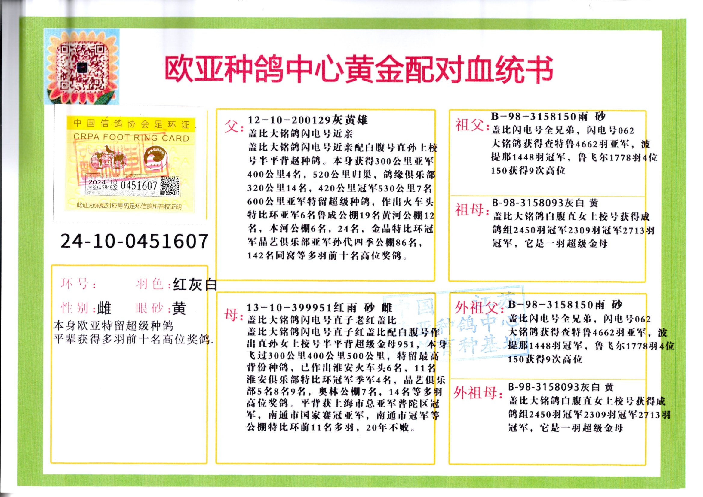 24年秋南京特比環(huán)歐亞榮獲大團(tuán)體冠軍.小團(tuán)體冠軍551公里大特比13名.14名.16名.19名.20名.21名.24名.26名.27名.28名.42名.52名.54名.57名.65名.66名.68名.70名.71名.72名.74名.76名.80名.82名.83名.84名.85名.86名.90名.92名.110名.116名.121名.122名.128名.131名.158名.161名.164名.165名.166名.172名.174名.177名.182名.195名.196名.201名.205名.208名.210名.216名.253名.269名.275名.276名.294名.296名.299名,,24年秋云南天南銅都公棚決賽415名.天南銅都小棚決賽409名.云南玉活公棚決賽102名.490名.團(tuán)體32名上籠二羽進(jìn)二羽,天南銅都大棚506公里決賽445名。熱烈祝賀河北省巨鹿縣李蘭生老師用歐亞泰山號血系連續(xù)十一年奪冠軍,河北省國家賽冠軍.全國季軍等多次前十名高位,揚州王軍王總用歐亞利奧24年春季獲山東翔宇公棚決賽33名蓋比53名。南京劉正龍劉總用歐亞蓋比獲得24年秋山東濰坊國際公棚決賽42名.精英賽30名.三關(guān)鴿王71名.決賽86名.加站賽16名.南京市特比環(huán)A組鴿王9名.B組鴿王5名.6名.C組鴿王5名.精英賽冠軍4名.技能賽A組冠軍4名.5名.秦淮區(qū)特比環(huán)榮獲15名.46名.48名.87名。四川西昌徐亮徐總用歐亞利奧獲得涼山州聚友決賽177名.第二關(guān)亞軍雙關(guān)鴿王19名.三關(guān)鴿王105名.云南豪庭公棚決賽603名。熱烈祝賀24年四川重慶翔園鴿舍用歐亞泰山號榮獲春季400公里冠軍.秋季500公里冠軍,河北王總用詹森X利奧獲得千羽千翔公棚400公里冠軍,廣東蔡楷煥榮獲24年秋愛好者 賽鴿俱樂部三關(guān)鴿王季軍.一關(guān)420公里99名.二關(guān)450公里11名.三關(guān)520公里32名.單關(guān)季軍.7名.12名,江西李衛(wèi)興榮獲貴州紅楓公棚8名.共翔俱樂部寄養(yǎng)棚四關(guān)綜合鴿王30名.一關(guān)400公里78名.二關(guān)500公里55名.三關(guān)520公里37名.四關(guān)500公里57名.同父母獲公棚18名.雷鳴獲得武漢黃浦育翔中心冠軍,四川陳文獲得四川明鴻俱樂部300公里夢幻2名.3名.4名.9名.10名.13名.14名.15名.31名.34名.40名.41名.42名.43名.69名.71名.72名.73名.74名.94名.95名.97名.98名.99名.419公里決賽榮獲總冠軍7名.總共歸巢9羽,四川徐亮獲豪庭決賽603名,山西鄭勇獲得山西泰鑫公棚決賽255名詹森紅狐,熱烈祝賀馬總獲得開爾(飛躍隊)決賽9名獲獎金1310000萬元.第一關(guān)52名,天津津福資賽180公里96名.獲獎金429543萬元,歐亞支持全國鴿友24年秋多人報喜 祝大家取得更好成績,給歐亞報喜鴿友歐亞決定給每人贈送一羽超級種鴿。歐亞俱樂部特比環(huán)多關(guān)鴿王成績:15年秋淮安特比環(huán)黑色星期一全會上籠9700多羽,當(dāng)天無鴿歸巢,第二天全會歸巢357羽,本舍歸巢158羽.前十名八羽.前一百名歸巢57羽,16年春季獲五關(guān)鴿王總冠軍,總亞軍四名.六名.七名.九名.十名.晶藝俱樂部520公里冠亞季軍5名.6名.7名.9名.11名等,火車頭冠軍.季軍6名.8名.9名.10名,16年秋晶藝俱樂部特比環(huán)520公里亞軍.季軍4名.6名.7名.9名,15年春南京白下特比環(huán)冠軍.亞軍.季軍6名.7名.8名.9名.10名.指定鴿A B組獲得冠軍.亞軍.季軍4名.5名.,17年淮安特比環(huán)亞軍.4名.5名.7名.8名.10名.六關(guān)鴿王總冠軍.4名.6名.9名.10名,寄養(yǎng)棚宿遷劉總20羽特比環(huán)獲冠軍.季軍.4名.7名.8名.9名等。18年榮獲萬羽特比環(huán)六關(guān)鴿王總冠軍.總亞軍.總季軍.6名.8名.十名.單關(guān)四羽冠軍.二羽亞軍.四羽季軍.前十名27羽。19年秋萬羽特比環(huán)六關(guān)鴿王總亞軍.總季軍.5名.8名等,單關(guān)二羽冠軍.三羽亞軍.一羽季軍前十名31羽。20年秋淮安市鴿會四關(guān)特比環(huán)大賽風(fēng)雨無阻鴿王亞軍.鴿王六名,金品俱樂部萬羽特比環(huán)六關(guān)鴿王總冠軍,總亞軍.四名.五名.六名.七名.八名.十名.前二百名鴿王35羽,單關(guān)冠亞季軍前十名四十多羽,火車頭五關(guān)鴿王季軍.六名.八名.前二百名鴿王十七羽。20年春榮獲淮安五區(qū)一市四關(guān)鴿王總冠軍.亞軍.四名.八名.九名。21年秋榮獲金品萬羽特比環(huán)大賽六關(guān)鴿王總亞軍.總季軍.四名.七名.九名.十名.單關(guān)冠亞軍季軍前十名三十多羽;疖囶^協(xié)會鴿王六名.七名.十名.單關(guān)前十名十七羽。22年秋榮獲鴿王總冠軍.總亞軍.5名.7名.8名.9名.11名.單關(guān)冠亞季軍前十名三十多羽,第一關(guān)單關(guān)前二百名四十多羽,第二關(guān)前二百名三十多羽,第三關(guān)前二百名四十多羽,第四關(guān)前二百名四十多羽,第五關(guān)前一百名53羽。23年秋榮獲鴿王季軍.五名.八名.十名.13名.17名.20名.27名等多羽鴿王.單關(guān)前十名二十多羽。公棚.寄養(yǎng)棚部分成績:16年秋寧夏黃河公棚總冠軍電腦戈馬力指定通炮冠軍,17年送八羽參賽獲得鴿王八名進(jìn)獎四名,支持韓總榮獲八名。支持鴿友榮獲寧夏中衛(wèi)公棚決賽總冠軍.精英賽冠軍,支持18年寧夏黃河公棚決賽冠軍詹森X泰山。安徽鼎博寄養(yǎng)棚院內(nèi)外四關(guān)鴿王總冠軍.鴿王十七名.三十七名同窩,鴿王39名.42名.58名.67名。18年山東公棚預(yù)賽冠軍.決賽65名.送八羽進(jìn)獎五羽.指定獲奔馳汽車一輛。支持鴿友獲得云南藍(lán)云公棚冠軍.蓋比X佛卡門。支持鴿友榮獲云南銀集公棚決賽冠軍 詹森427X520血系 速度賽6700羽冠軍。17年榮獲金馬俱樂部寄養(yǎng)棚四關(guān)鴿王總冠軍.季軍.六名.八名.第一關(guān)冠軍.亞軍.季軍四名.七名.十一名.金牌教練獎。支持鴿友18