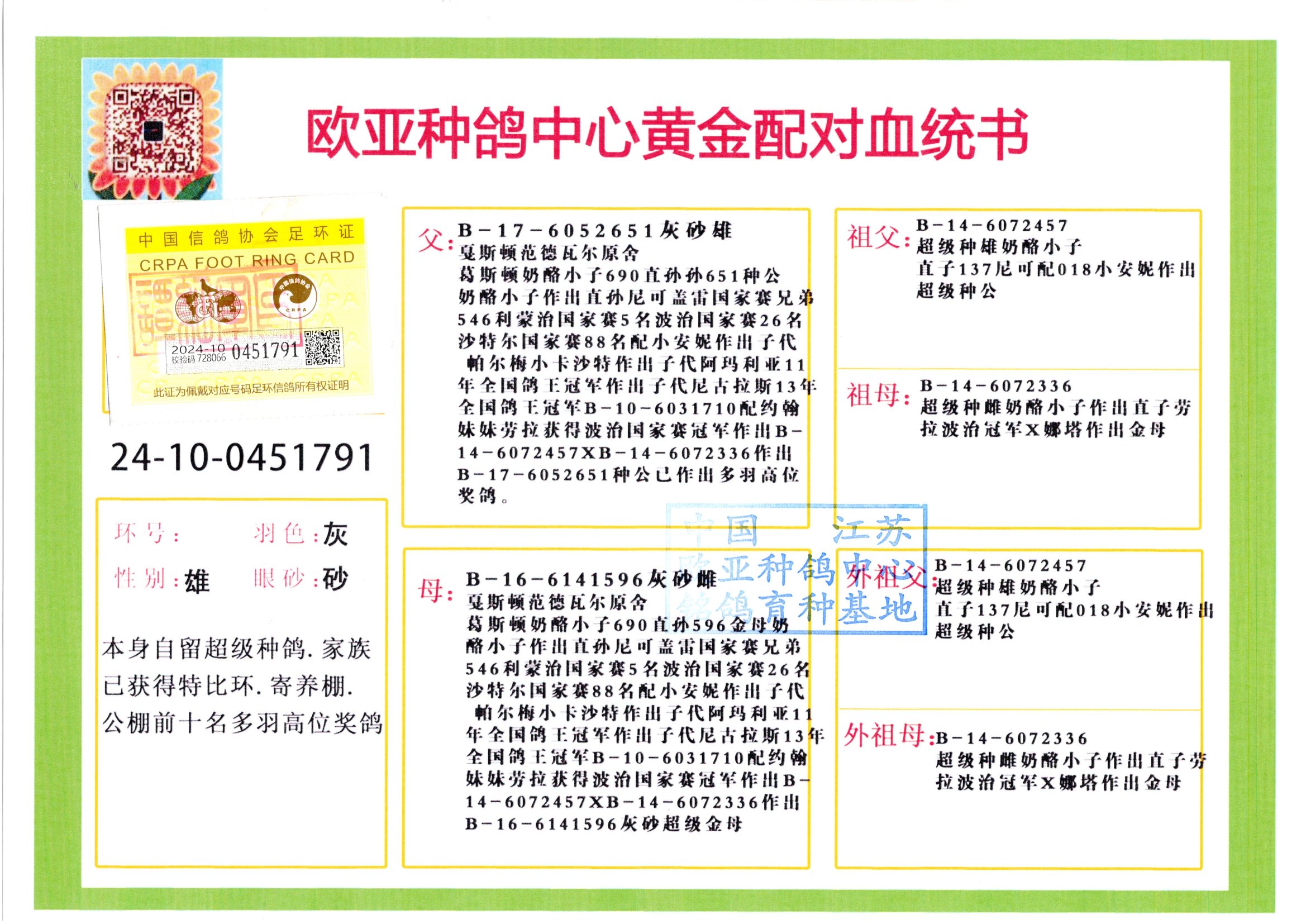 24年秋南京特比環(huán)歐亞榮獲大團體冠軍.小團體冠軍551公里大特比13名.14名.16名.19名.20名.21名.24名.26名.27名.28名.42名.52名.54名.57名.65名.66名.68名.70名.71名.72名.74名.76名.80名.82名.83名.84名.85名.86名.90名.92名.110名.116名.121名.122名.128名.131名.158名.161名.164名.165名.166名.172名.174名.177名.182名.195名.196名.201名.205名.208名.210名.216名.253名.269名.275名.276名.294名.296名.299名,,24年秋云南天南銅都公棚決賽415名.天南銅都小棚決賽409名.云南玉活公棚決賽102名.490名.團體32名上籠二羽進二羽,天南銅都大棚506公里決賽445名。熱烈祝賀河北省巨鹿縣李蘭生老師用歐亞泰山號血系連續(xù)十一年奪冠軍,河北省國家賽冠軍.全國季軍等多次前十名高位,揚州王軍王總用歐亞利奧24年春季獲山東翔宇公棚決賽33名蓋比53名。南京劉正龍劉總用歐亞蓋比獲得24年秋山東濰坊國際公棚決賽42名.精英賽30名.三關(guān)鴿王71名.決賽86名.加站賽16名.南京市特比環(huán)A組鴿王9名.B組鴿王5名.6名.C組鴿王5名.精英賽冠軍4名.技能賽A組冠軍4名.5名.秦淮區(qū)特比環(huán)榮獲15名.46名.48名.87名。四川西昌徐亮徐總用歐亞利奧獲得涼山州聚友決賽177名.第二關(guān)亞軍雙關(guān)鴿王19名.三關(guān)鴿王105名.云南豪庭公棚決賽603名。熱烈祝賀24年四川重慶翔園鴿舍用歐亞泰山號榮獲春季400公里冠軍.秋季500公里冠軍,河北王總用詹森X利奧獲得千羽千翔公棚400公里冠軍,廣東蔡楷煥榮獲24年秋愛好者 賽鴿俱樂部三關(guān)鴿王季軍.一關(guān)420公里99名.二關(guān)450公里11名.三關(guān)520公里32名.單關(guān)季軍.7名.12名,江西李衛(wèi)興榮獲貴州紅楓公棚8名.共翔俱樂部寄養(yǎng)棚四關(guān)綜合鴿王30名.一關(guān)400公里78名.二關(guān)500公里55名.三關(guān)520公里37名.四關(guān)500公里57名.同父母獲公棚18名.雷鳴獲得武漢黃浦育翔中心冠軍,四川陳文獲得四川明鴻俱樂部300公里夢幻2名.3名.4名.9名.10名.13名.14名.15名.31名.34名.40名.41名.42名.43名.69名.71名.72名.73名.74名.94名.95名.97名.98名.99名.419公里決賽榮獲總冠軍7名.總共歸巢9羽,四川徐亮獲豪庭決賽603名,山西鄭勇獲得山西泰鑫公棚決賽255名詹森紅狐,熱烈祝賀馬總獲得開爾(飛躍隊)決賽9名獲獎金1310000萬元.第一關(guān)52名,天津津福資賽180公里96名.獲獎金429543萬元,歐亞支持全國鴿友24年秋多人報喜 祝大家取得更好成績,給歐亞報喜鴿友歐亞決定給每人贈送一羽超級種鴿。歐亞俱樂部特比環(huán)多關(guān)鴿王成績:15年秋淮安特比環(huán)黑色星期一全會上籠9700多羽,當(dāng)天無鴿歸巢,第二天全會歸巢357羽,本舍歸巢158羽.前十名八羽.前一百名歸巢57羽,16年春季獲五關(guān)鴿王總冠軍,總亞軍四名.六名.七名.九名.十名.晶藝俱樂部520公里冠亞季軍5名.6名.7名.9名.11名等,火車頭冠軍.季軍6名.8名.9名.10名,16年秋晶藝俱樂部特比環(huán)520公里亞軍.季軍4名.6名.7名.9名,15年春南京白下特比環(huán)冠軍.亞軍.季軍6名.7名.8名.9名.10名.指定鴿A B組獲得冠軍.亞軍.季軍4名.5名.,17年淮安特比環(huán)亞軍.4名.5名.7名.8名.10名.六關(guān)鴿王總冠軍.4名.6名.9名.10名,寄養(yǎng)棚宿遷劉總20羽特比環(huán)獲冠軍.季軍.4名.7名.8名.9名等。18年榮獲萬羽特比環(huán)六關(guān)鴿王總冠軍.總亞軍.總季軍.6名.8名.十名.單關(guān)四羽冠軍.二羽亞軍.四羽季軍.前十名27羽。19年秋萬羽特比環(huán)六關(guān)鴿王總亞軍.總季軍.5名.8名等,單關(guān)二羽冠軍.三羽亞軍.一羽季軍前十名31羽。20年秋淮安市鴿會四關(guān)特比環(huán)大賽風(fēng)雨無阻鴿王亞軍.鴿王六名,金品俱樂部萬羽特比環(huán)六關(guān)鴿王總冠軍,總亞軍.四名.五名.六名.七名.八名.十名.前二百名鴿王35羽,單關(guān)冠亞季軍前十名四十多羽,火車頭五關(guān)鴿王季軍.六名.八名.前二百名鴿王十七羽。20年春榮獲淮安五區(qū)一市四關(guān)鴿王總冠軍.亞軍.四名.八名.九名。21年秋榮獲金品萬羽特比環(huán)大賽六關(guān)鴿王總亞軍.總季軍.四名.七名.九名.十名.單關(guān)冠亞軍季軍前十名三十多羽;疖囶^協(xié)會鴿王六名.七名.十名.單關(guān)前十名十七羽。22年秋榮獲鴿王總冠軍.總亞軍.5名.7名.8名.9名.11名.單關(guān)冠亞季軍前十名三十多羽,第一關(guān)單關(guān)前二百名四十多羽,第二關(guān)前二百名三十多羽,第三關(guān)前二百名四十多羽,第四關(guān)前二百名四十多羽,第五關(guān)前一百名53羽。23年秋榮獲鴿王季軍.五名.八名.十名.13名.17名.20名.27名等多羽鴿王.單關(guān)前十名二十多羽。公棚.寄養(yǎng)棚部分成績:16年秋寧夏黃河公棚總冠軍電腦戈馬力指定通炮冠軍,17年送八羽參賽獲得鴿王八名進獎四名,支持韓總榮獲八名。支持鴿友榮獲寧夏中衛(wèi)公棚決賽總冠軍.精英賽冠軍,支持18年寧夏黃河公棚決賽冠軍詹森X泰山。安徽鼎博寄養(yǎng)棚院內(nèi)外四關(guān)鴿王總冠軍.鴿王十七名.三十七名同窩,鴿王39名.42名.58名.67名。18年山東公棚預(yù)賽冠軍.決賽65名.送八羽進獎五羽.指定獲奔馳汽車一輛。支持鴿友獲得云南藍云公棚冠軍.蓋比X佛卡門。支持鴿友榮獲云南銀集公棚決賽冠軍 詹森427X520血系 速度賽6700羽冠軍。17年榮獲金馬俱樂部寄養(yǎng)棚四關(guān)鴿王總冠軍.季軍.六名.八名.第一關(guān)冠軍.亞軍.季軍四名.七名.十一名.金牌教練獎。支持鴿友18年北京費翔公棚預(yù)賽九名電腦X
