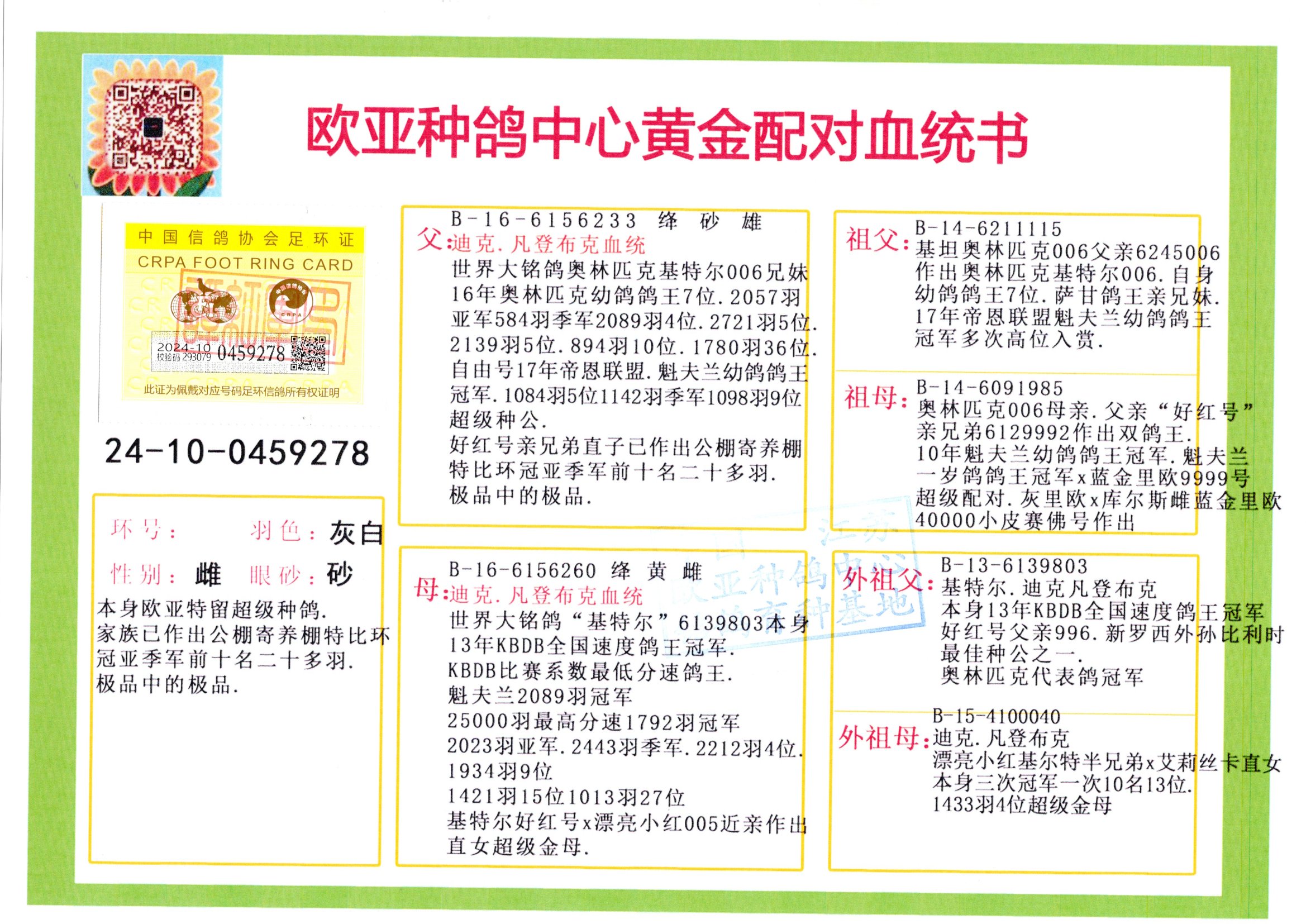 24年秋南京特比環(huán)歐亞榮獲大團(tuán)體冠軍.小團(tuán)體冠軍551公里大特比13名.14名.16名.19名.20名.21名.24名.26名.27名.28名.42名.52名.54名.57名.65名.66名.68名.70名.71名.72名.74名.76名.80名.82名.83名.84名.85名.86名.90名.92名.110名.116名.121名.122名.128名.131名.158名.161名.164名.165名.166名.172名.174名.177名.182名.195名.196名.201名.205名.208名.210名.216名.253名.269名.275名.276名.294名.296名.299名,,24年秋云南天南銅都公棚決賽415名.天南銅都小棚決賽409名.云南玉活公棚決賽102名.490名.團(tuán)體32名上籠二羽進(jìn)二羽,天南銅都大棚506公里決賽445名。熱烈祝賀河北省巨鹿縣李蘭生老師用歐亞泰山號血系連續(xù)十一年奪冠軍,河北省國家賽冠軍.全國季軍等多次前十名高位,揚州王軍王總用歐亞利奧24年春季獲山東翔宇公棚決賽33名蓋比53名。南京劉正龍劉總用歐亞蓋比獲得24年秋山東濰坊國際公棚決賽42名.精英賽30名.三關(guān)鴿王71名.決賽86名.加站賽16名.南京市特比環(huán)A組鴿王9名.B組鴿王5名.6名.C組鴿王5名.精英賽冠軍4名.技能賽A組冠軍4名.5名.秦淮區(qū)特比環(huán)榮獲15名.46名.48名.87名。四川西昌徐亮徐總用歐亞利奧獲得涼山州聚友決賽177名.第二關(guān)亞軍雙關(guān)鴿王19名.三關(guān)鴿王105名.云南豪庭公棚決賽603名。熱烈祝賀24年四川重慶翔園鴿舍用歐亞泰山號榮獲春季400公里冠軍.秋季500公里冠軍,河北王總用詹森X利奧獲得千羽千翔公棚400公里冠軍,廣東蔡楷煥榮獲24年秋愛好者 賽鴿俱樂部三關(guān)鴿王季軍.一關(guān)420公里99名.二關(guān)450公里11名.三關(guān)520公里32名.單關(guān)季軍.7名.12名,江西李衛(wèi)興榮獲貴州紅楓公棚8名.共翔俱樂部寄養(yǎng)棚四關(guān)綜合鴿王30名.一關(guān)400公里78名.二關(guān)500公里55名.三關(guān)520公里37名.四關(guān)500公里57名.同父母獲公棚18名.雷鳴獲得武漢黃浦育翔中心冠軍,四川陳文獲得四川明鴻俱樂部300公里夢幻2名.3名.4名.9名.10名.13名.14名.15名.31名.34名.40名.41名.42名.43名.69名.71名.72名.73名.74名.94名.95名.97名.98名.99名.419公里決賽榮獲總冠軍7名.總共歸巢9羽,四川徐亮獲豪庭決賽603名,山西鄭勇獲得山西泰鑫公棚決賽255名詹森紅狐,熱烈祝賀馬總獲得開爾(飛躍隊)決賽9名獲獎金1310000萬元.第一關(guān)52名,天津津福資賽180公里96名.獲獎金429543萬元,歐亞支持全國鴿友24年秋多人報喜 祝大家取得更好成績,給歐亞報喜鴿友歐亞決定給每人贈送一羽超級種鴿。歐亞俱樂部特比環(huán)多關(guān)鴿王成績:15年秋淮安特比環(huán)黑色星期一全會上籠9700多羽,當(dāng)天無鴿歸巢,第二天全會歸巢357羽,本舍歸巢158羽.前十名八羽.前一百名歸巢57羽,16年春季獲五關(guān)鴿王總冠軍,總亞軍四名.六名.七名.九名.十名.晶藝俱樂部520公里冠亞季軍5名.6名.7名.9名.11名等,火車頭冠軍.季軍6名.8名.9名.10名,16年秋晶藝俱樂部特比環(huán)520公里亞軍.季軍4名.6名.7名.9名,15年春南京白下特比環(huán)冠軍.亞軍.季軍6名.7名.8名.9名.10名.指定鴿A B組獲得冠軍.亞軍.季軍4名.5名.,17年淮安特比環(huán)亞軍.4名.5名.7名.8名.10名.六關(guān)鴿王總冠軍.4名.6名.9名.10名,寄養(yǎng)棚宿遷劉總20羽特比環(huán)獲冠軍.季軍.4名.7名.8名.9名等。18年榮獲萬羽特比環(huán)六關(guān)鴿王總冠軍.總亞軍.總季軍.6名.8名.十名.單關(guān)四羽冠軍.二羽亞軍.四羽季軍.前十名27羽。19年秋萬羽特比環(huán)六關(guān)鴿王總亞軍.總季軍.5名.8名等,單關(guān)二羽冠軍.三羽亞軍.一羽季軍前十名31羽。20年秋淮安市鴿會四關(guān)特比環(huán)大賽風(fēng)雨無阻鴿王亞軍.鴿王六名,金品俱樂部萬羽特比環(huán)六關(guān)鴿王總冠軍,總亞軍.四名.五名.六名.七名.八名.十名.前二百名鴿王35羽,單關(guān)冠亞季軍前十名四十多羽,火車頭五關(guān)鴿王季軍.六名.八名.前二百名鴿王十七羽。20年春榮獲淮安五區(qū)一市四關(guān)鴿王總冠軍.亞軍.四名.八名.九名。21年秋榮獲金品萬羽特比環(huán)大賽六關(guān)鴿王總亞軍.總季軍.四名.七名.九名.十名.單關(guān)冠亞軍季軍前十名三十多羽;疖囶^協(xié)會鴿王六名.七名.十名.單關(guān)前十名十七羽。22年秋榮獲鴿王總冠軍.總亞軍.5名.7名.8名.9名.11名.單關(guān)冠亞季軍前十名三十多羽,第一關(guān)單關(guān)前二百名四十多羽,第二關(guān)前二百名三十多羽,第三關(guān)前二百名四十多羽,第四關(guān)前二百名四十多羽,第五關(guān)前一百名53羽。23年秋榮獲鴿王季軍.五名.八名.十名.13名.17名.20名.27名等多羽鴿王.單關(guān)前十名二十多羽。公棚.寄養(yǎng)棚部分成績:16年秋寧夏黃河公棚總冠軍電腦戈馬力指定通炮冠軍,17年送八羽參賽獲得鴿王八名進(jìn)獎四名,支持韓總榮獲八名。支持鴿友榮獲寧夏中衛(wèi)公棚決賽總冠軍.精英賽冠軍,支持18年寧夏黃河公棚決賽冠軍詹森X泰山。安徽鼎博寄養(yǎng)棚院內(nèi)外四關(guān)鴿王總冠軍.鴿王十七名.三十七名同窩,鴿王39名.42名.58名.67名。18年山東公棚預(yù)賽冠軍.決賽65名.送八羽進(jìn)獎五羽.指定獲奔馳汽車一輛。支持鴿友獲得云南藍(lán)云公棚冠軍.蓋比X佛卡門。支持鴿友榮獲云南銀集公棚決賽冠軍 詹森427X520血系 速度賽6700羽冠軍。17年榮獲金馬俱樂部寄養(yǎng)棚四關(guān)鴿王總冠軍.季軍.六名.八名.第一關(guān)冠軍.亞軍.季軍四名.七名.十一名.金牌教練獎。支持鴿友18