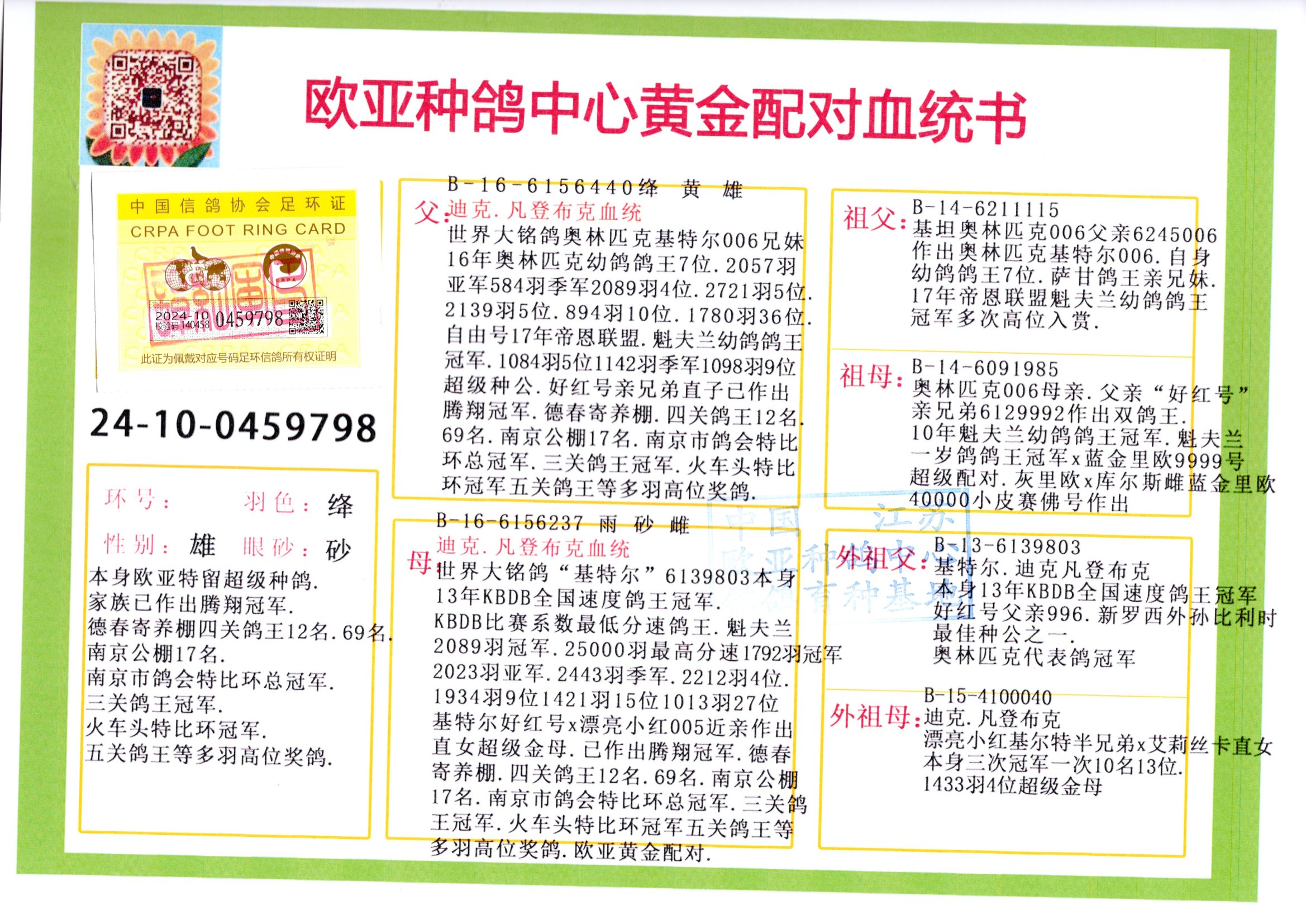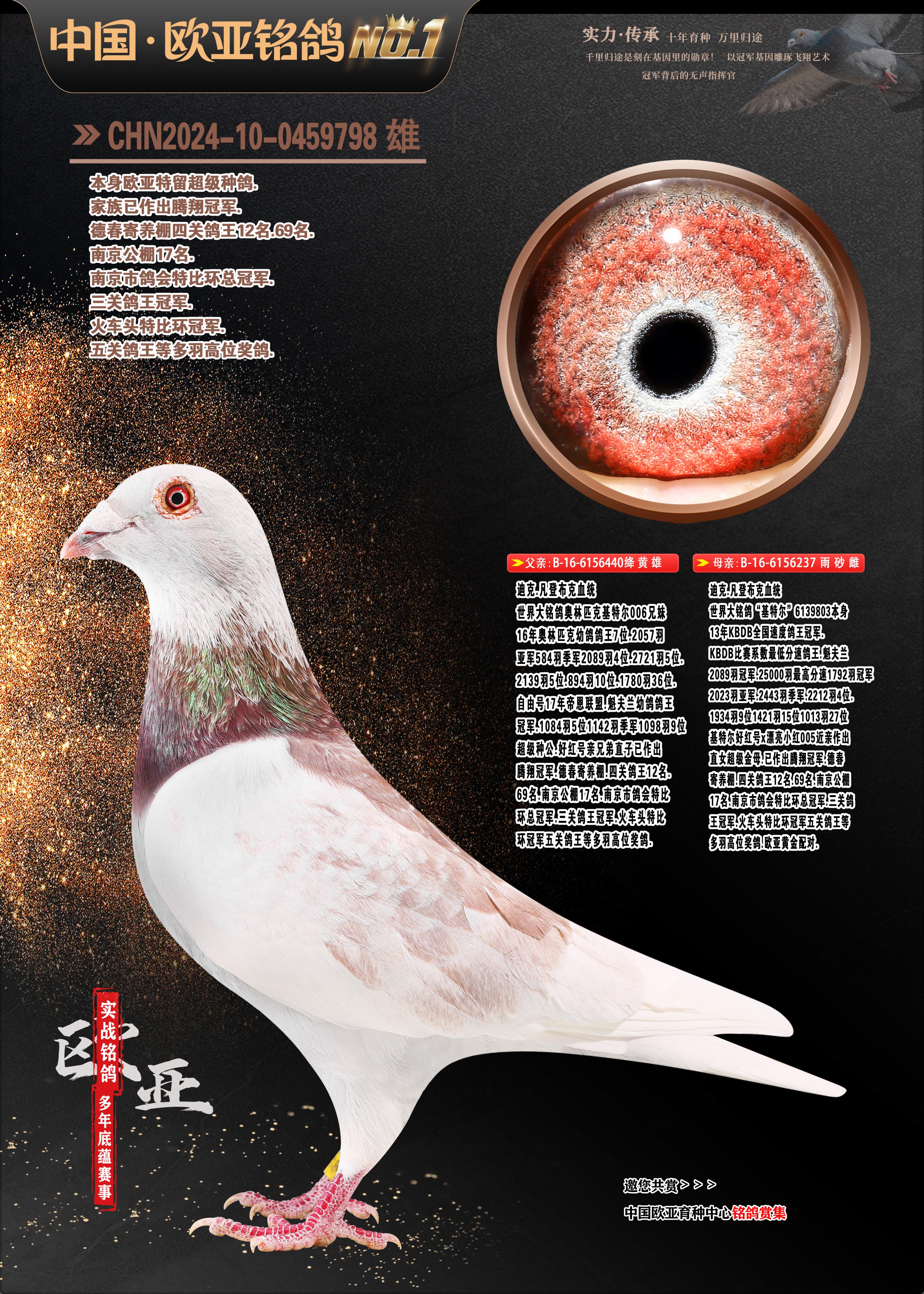 24年秋南京特比環(huán)歐亞榮獲大團體冠軍.小團體冠軍551公里大特比13名.14名.16名.19名.20名.21名.24名.26名.27名.28名.42名.52名.54名.57名.65名.66名.68名.70名.71名.72名.74名.76名.80名.82名.83名.84名.85名.86名.90名.92名.110名.116名.121名.122名.128名.131名.158名.161名.164名.165名.166名.172名.174名.177名.182名.195名.196名.201名.205名.208名.210名.216名.253名.269名.275名.276名.294名.296名.299名,,24年秋云南天南銅都公棚決賽415名.天南銅都小棚決賽409名.云南玉活公棚決賽102名.490名.團體32名上籠二羽進二羽,天南銅都大棚506公里決賽445名。熱烈祝賀河北省巨鹿縣李蘭生老師用歐亞泰山號血系連續(xù)十一年奪冠軍,河北省國家賽冠軍.全國季軍等多次前十名高位,揚州王軍王總用歐亞利奧24年春季獲山東翔宇公棚決賽33名蓋比53名。南京劉正龍劉總用歐亞蓋比獲得24年秋山東濰坊國際公棚決賽42名.精英賽30名.三關鴿王71名.決賽86名.加站賽16名.南京市特比環(huán)A組鴿王9名.B組鴿王5名.6名.C組鴿王5名.精英賽冠軍4名.技能賽A組冠軍4名.5名.秦淮區(qū)特比環(huán)榮獲15名.46名.48名.87名。四川西昌徐亮徐總用歐亞利奧獲得涼山州聚友決賽177名.第二關亞軍雙關鴿王19名.三關鴿王105名.云南豪庭公棚決賽603名。熱烈祝賀24年四川重慶翔園鴿舍用歐亞泰山號榮獲春季400公里冠軍.秋季500公里冠軍,河北王總用詹森X利奧獲得千羽千翔公棚400公里冠軍,廣東蔡楷煥榮獲24年秋愛好者 賽鴿俱樂部三關鴿王季軍.一關420公里99名.二關450公里11名.三關520公里32名.單關季軍.7名.12名,江西李衛(wèi)興榮獲貴州紅楓公棚8名.共翔俱樂部寄養(yǎng)棚四關綜合鴿王30名.一關400公里78名.二關500公里55名.三關520公里37名.四關500公里57名.同父母獲公棚18名.雷鳴獲得武漢黃浦育翔中心冠軍,四川陳文獲得四川明鴻俱樂部300公里夢幻2名.3名.4名.9名.10名.13名.14名.15名.31名.34名.40名.41名.42名.43名.69名.71名.72名.73名.74名.94名.95名.97名.98名.99名.419公里決賽榮獲總冠軍7名.總共歸巢9羽,四川徐亮獲豪庭決賽603名,山西鄭勇獲得山西泰鑫公棚決賽255名詹森紅狐,熱烈祝賀馬總獲得開爾(飛躍隊)決賽9名獲獎金1310000萬元.第一關52名,天津津福資賽180公里96名.獲獎金429543萬元,歐亞支持全國鴿友24年秋多人報喜 祝大家取得更好成績,給歐亞報喜鴿友歐亞決定給每人贈送一羽超級種鴿。歐亞俱樂部特比環(huán)多關鴿王成績:15年秋淮安特比環(huán)黑色星期一全會上籠9700多羽,當天無鴿歸巢,第二天全會歸巢357羽,本舍歸巢158羽.前十名八羽.前一百名歸巢57羽,16年春季獲五關鴿王總冠軍,總亞軍四名.六名.七名.九名.十名.晶藝俱樂部520公里冠亞季軍5名.6名.7名.9名.11名等,火車頭冠軍.季軍6名.8名.9名.10名,16年秋晶藝俱樂部特比環(huán)520公里亞軍.季軍4名.6名.7名.9名,15年春南京白下特比環(huán)冠軍.亞軍.季軍6名.7名.8名.9名.10名.指定鴿A B組獲得冠軍.亞軍.季軍4名.5名.,17年淮安特比環(huán)亞軍.4名.5名.7名.8名.10名.六關鴿王總冠軍.4名.6名.9名.10名,寄養(yǎng)棚宿遷劉總20羽特比環(huán)獲冠軍.季軍.4名.7名.8名.9名等。18年榮獲萬羽特比環(huán)六關鴿王總冠軍.總亞軍.總季軍.6名.8名.十名.單關四羽冠軍.二羽亞軍.四羽季軍.前十名27羽。19年秋萬羽特比環(huán)六關鴿王總亞軍.總季軍.5名.8名等,單關二羽冠軍.三羽亞軍.一羽季軍前十名31羽。20年秋淮安市鴿會四關特比環(huán)大賽風雨無阻鴿王亞軍.鴿王六名,金品俱樂部萬羽特比環(huán)六關鴿王總冠軍,總亞軍.四名.五名.六名.七名.八名.十名.前二百名鴿王35羽,單關冠亞季軍前十名四十多羽,火車頭五關鴿王季軍.六名.八名.前二百名鴿王十七羽。20年春榮獲淮安五區(qū)一市四關鴿王總冠軍.亞軍.四名.八名.九名。21年秋榮獲金品萬羽特比環(huán)大賽六關鴿王總亞軍.總季軍.四名.七名.九名.十名.單關冠亞軍季軍前十名三十多羽;疖囶^協(xié)會鴿王六名.七名.十名.單關前十名十七羽。22年秋榮獲鴿王總冠軍.總亞軍.5名.7名.8名.9名.11名.單關冠亞季軍前十名三十多羽,第一關單關前二百名四十多羽,第二關前二百名三十多羽,第三關前二百名四十多羽,第四關前二百名四十多羽,第五關前一百名53羽。23年秋榮獲鴿王季軍.五名.八名.十名.13名.17名.20名.27名等多羽鴿王.單關前十名二十多羽。公棚.寄養(yǎng)棚部分成績:16年秋寧夏黃河公棚總冠軍電腦戈馬力指定通炮冠軍,17年送八羽參賽獲得鴿王八名進獎四名,支持韓總榮獲八名。支持鴿友榮獲寧夏中衛(wèi)公棚決賽總冠軍.精英賽冠軍,支持18年寧夏黃河公棚決賽冠軍詹森X泰山。安徽鼎博寄養(yǎng)棚院內外四關鴿王總冠軍.鴿王十七名.三十七名同窩,鴿王39名.42名.58名.67名。18年山東公棚預賽冠軍.決賽65名.送八羽進獎五羽.指定獲奔馳汽車一輛。支持鴿友獲得云南藍云公棚冠軍.蓋比X佛卡門。支持鴿友榮獲云南銀集公棚決賽冠軍 詹森427X520血系 速度賽6700羽冠軍。17年榮獲金馬俱樂部寄養(yǎng)棚四關鴿王總冠軍.季軍.六名.八名.第一關冠軍.亞軍.季軍四名.七名.十一名.金牌教練獎。支持鴿友18年北京費翔公棚預賽九名電腦X桑杰士,支持鴿友榮獲陜西威力公棚決賽11名.內蒙古臨河寄養(yǎng)棚四關鴿王六名.詹森配泰山,支持河北王總用歐亞詹森427配胡本喜獲20年秋開爾青年棚季軍。云南東榮公棚16年預賽冠軍.決賽77名.17年決賽12名.詹森紅狐X泰山,17年平安公棚決賽4名