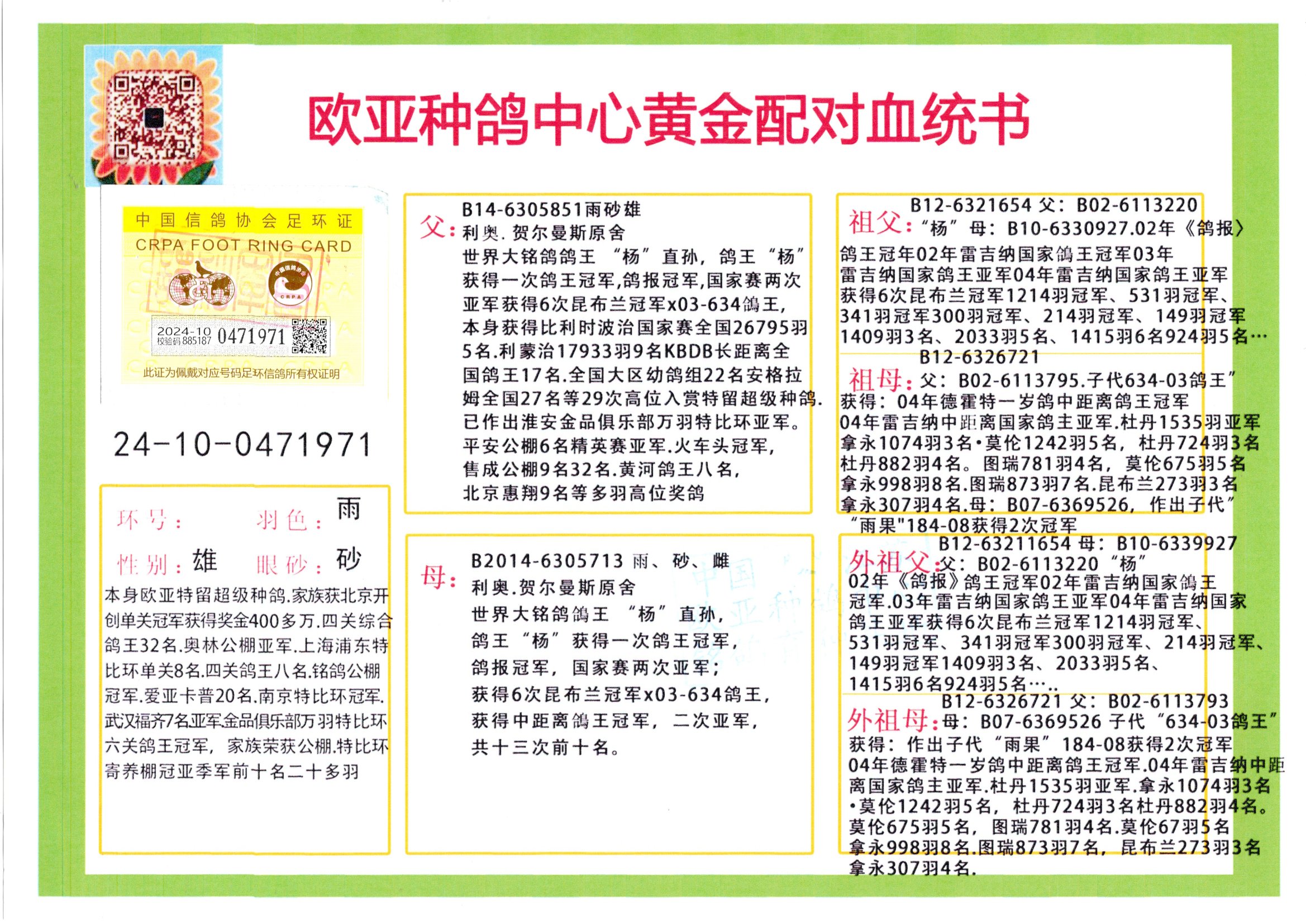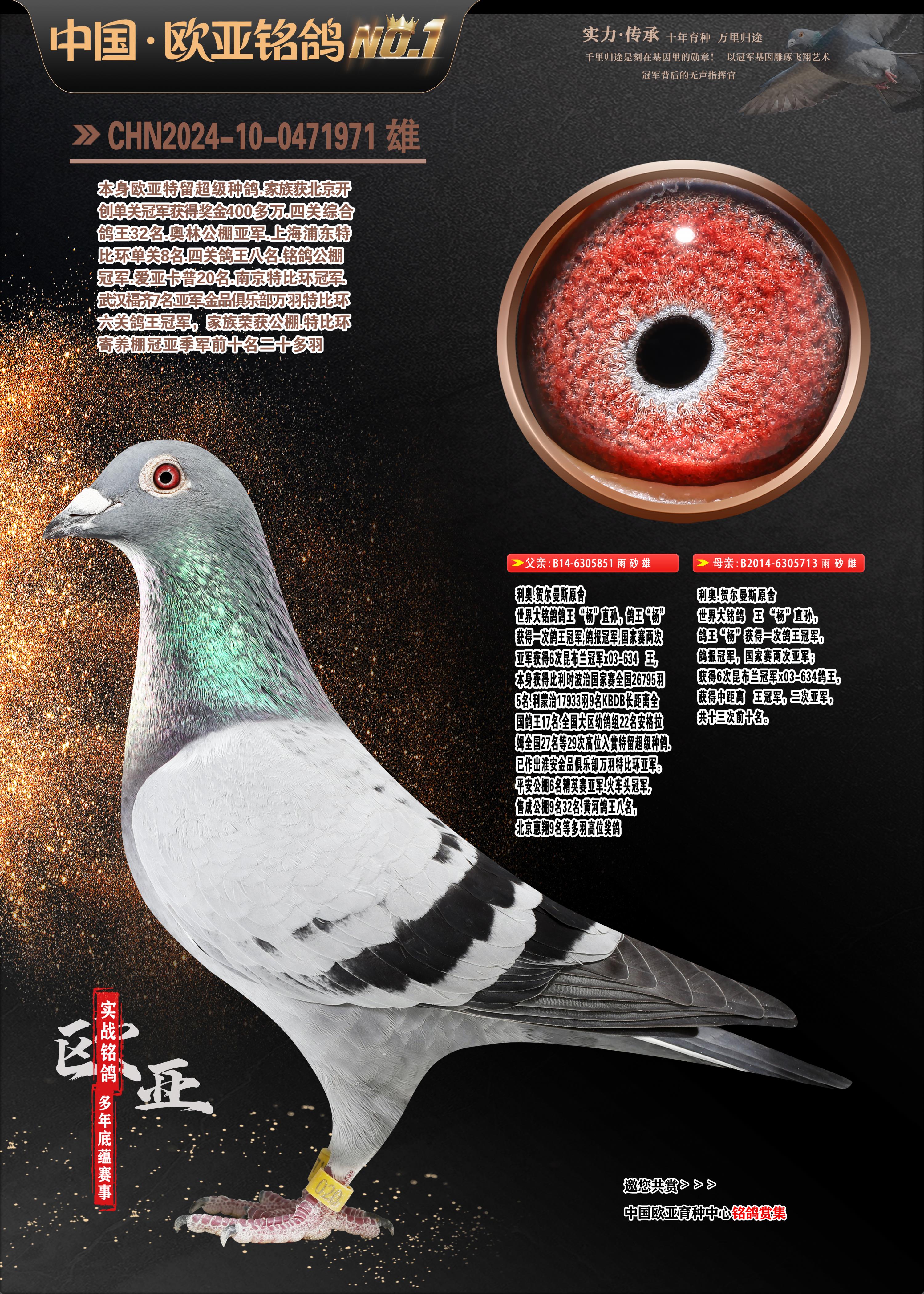 24年秋南京特比環(huán)歐亞榮獲大團體冠軍.小團體冠軍551公里大特比13名.14名.16名.19名.20名.21名.24名.26名.27名.28名.42名.52名.54名.57名.65名.66名.68名.70名.71名.72名.74名.76名.80名.82名.83名.84名.85名.86名.90名.92名.110名.116名.121名.122名.128名.131名.158名.161名.164名.165名.166名.172名.174名.177名.182名.195名.196名.201名.205名.208名.210名.216名.253名.269名.275名.276名.294名.296名.299名,,24年秋云南天南銅都公棚決賽415名.天南銅都小棚決賽409名.云南玉活公棚決賽102名.490名.團體32名上籠二羽進二羽,天南銅都大棚506公里決賽445名。熱烈祝賀河北省巨鹿縣李蘭生老師用歐亞泰山號血系連續(xù)十一年奪冠軍,河北省國家賽冠軍.全國季軍等多次前十名高位,揚州王軍王總用歐亞利奧24年春季獲山東翔宇公棚決賽33名蓋比53名。南京劉正龍劉總用歐亞蓋比獲得24年秋山東濰坊國際公棚決賽42名.精英賽30名.三關鴿王71名.決賽86名.加站賽16名.南京市特比環(huán)A組鴿王9名.B組鴿王5名.6名.C組鴿王5名.精英賽冠軍4名.技能賽A組冠軍4名.5名.秦淮區(qū)特比環(huán)榮獲15名.46名.48名.87名。四川西昌徐亮徐總用歐亞利奧獲得涼山州聚友決賽177名.第二關亞軍雙關鴿王19名.三關鴿王105名.云南豪庭公棚決賽603名。熱烈祝賀24年四川重慶翔園鴿舍用歐亞泰山號榮獲春季400公里冠軍.秋季500公里冠軍,河北王總用詹森X利奧獲得千羽千翔公棚400公里冠軍,廣東蔡楷煥榮獲24年秋愛好者 賽鴿俱樂部三關鴿王季軍.一關420公里99名.二關450公里11名.三關520公里32名.單關季軍.7名.12名,江西李衛(wèi)興榮獲貴州紅楓公棚8名.共翔俱樂部寄養(yǎng)棚四關綜合鴿王30名.一關400公里78名.二關500公里55名.三關520公里37名.四關500公里57名.同父母獲公棚18名.雷鳴獲得武漢黃浦育翔中心冠軍,四川陳文獲得四川明鴻俱樂部300公里夢幻2名.3名.4名.9名.10名.13名.14名.15名.31名.34名.40名.41名.42名.43名.69名.71名.72名.73名.74名.94名.95名.97名.98名.99名.419公里決賽榮獲總冠軍7名.總共歸巢9羽,四川徐亮獲豪庭決賽603名,山西鄭勇獲得山西泰鑫公棚決賽255名詹森紅狐,熱烈祝賀馬總獲得開爾(飛躍隊)決賽9名獲獎金1310000萬元.第一關52名,天津津福資賽180公里96名.獲獎金429543萬元,歐亞支持全國鴿友24年秋多人報喜 祝大家取得更好成績,給歐亞報喜鴿友歐亞決定給每人贈送一羽超級種鴿。歐亞俱樂部特比環(huán)多關鴿王成績:15年秋淮安特比環(huán)黑色星期一全會上籠9700多羽,當天無鴿歸巢,第二天全會歸巢357羽,本舍歸巢158羽.前十名八羽.前一百名歸巢57羽,16年春季獲五關鴿王總冠軍,總亞軍四名.六名.七名.九名.十名.晶藝俱樂部520公里冠亞季軍5名.6名.7名.9名.11名等,火車頭冠軍.季軍6名.8名.9名.10名,16年秋晶藝俱樂部特比環(huán)520公里亞軍.季軍4名.6名.7名.9名,15年春南京白下特比環(huán)冠軍.亞軍.季軍6名.7名.8名.9名.10名.指定鴿A B組獲得冠軍.亞軍.季軍4名.5名.,17年淮安特比環(huán)亞軍.4名.5名.7名.8名.10名.六關鴿王總冠軍.4名.6名.9名.10名,寄養(yǎng)棚宿遷劉總20羽特比環(huán)獲冠軍.季軍.4名.7名.8名.9名等。18年榮獲萬羽特比環(huán)六關鴿王總冠軍.總亞軍.總季軍.6名.8名.十名.單關四羽冠軍.二羽亞軍.四羽季軍.前十名27羽。19年秋萬羽特比環(huán)六關鴿王總亞軍.總季軍.5名.8名等,單關二羽冠軍.三羽亞軍.一羽季軍前十名31羽。20年秋淮安市鴿會四關特比環(huán)大賽風雨無阻鴿王亞軍.鴿王六名,金品俱樂部萬羽特比環(huán)六關鴿王總冠軍,總亞軍.四名.五名.六名.七名.八名.十名.前二百名鴿王35羽,單關冠亞季軍前十名四十多羽,火車頭五關鴿王季軍.六名.八名.前二百名鴿王十七羽。20年春榮獲淮安五區(qū)一市四關鴿王總冠軍.亞軍.四名.八名.九名。21年秋榮獲金品萬羽特比環(huán)大賽六關鴿王總亞軍.總季軍.四名.七名.九名.十名.單關冠亞軍季軍前十名三十多羽;疖囶^協(xié)會鴿王六名.七名.十名.單關前十名十七羽。22年秋榮獲鴿王總冠軍.總亞軍.5名.7名.8名.9名.11名.單關冠亞季軍前十名三十多羽,第一關單關前二百名四十多羽,第二關前二百名三十多羽,第三關前二百名四十多羽,第四關前二百名四十多羽,第五關前一百名53羽。23年秋榮獲鴿王季軍.五名.八名.十名.13名.17名.20名.27名等多羽鴿王.單關前十名二十多羽。公棚.寄養(yǎng)棚部分成績:16年秋寧夏黃河公棚總冠軍電腦戈馬力指定通炮冠軍,17年送八羽參賽獲得鴿王八名進獎四名,支持韓總榮獲八名。支持鴿友榮獲寧夏中衛(wèi)公棚決賽總冠軍.精英賽冠軍,支持18年寧夏黃河公棚決賽冠軍詹森X泰山。安徽鼎博寄養(yǎng)棚院內外四關鴿王總冠軍.鴿王十七名.三十七名同窩,鴿王39名.42名.58名.67名。18年山東公棚預賽冠軍.決賽65名.送八羽進獎五羽.指定獲奔馳汽車一輛。支持鴿友獲得云南藍云公棚冠軍.蓋比X佛卡門。支持鴿友榮獲云南銀集公棚決賽冠軍 詹森427X520血系 速度賽6700羽冠軍。17年榮獲金馬俱樂部寄養(yǎng)棚四關鴿王總冠軍.季軍.六名.八名.第一關冠軍.亞軍.季軍四名.七名.十一名.金牌教練獎。支持鴿友18年北京費翔公棚預賽九名電腦X桑杰士,支持鴿友榮獲陜西威力公棚決賽11名.內蒙古臨河寄養(yǎng)棚四關鴿王六名.詹森配泰山,支持河北王總用歐亞詹森427配胡本喜獲20年秋開爾青年棚季軍。云南東榮公棚16年預賽冠軍.決賽77名.17年決賽12名.詹森紅狐X泰山,17年平安公棚決賽4名