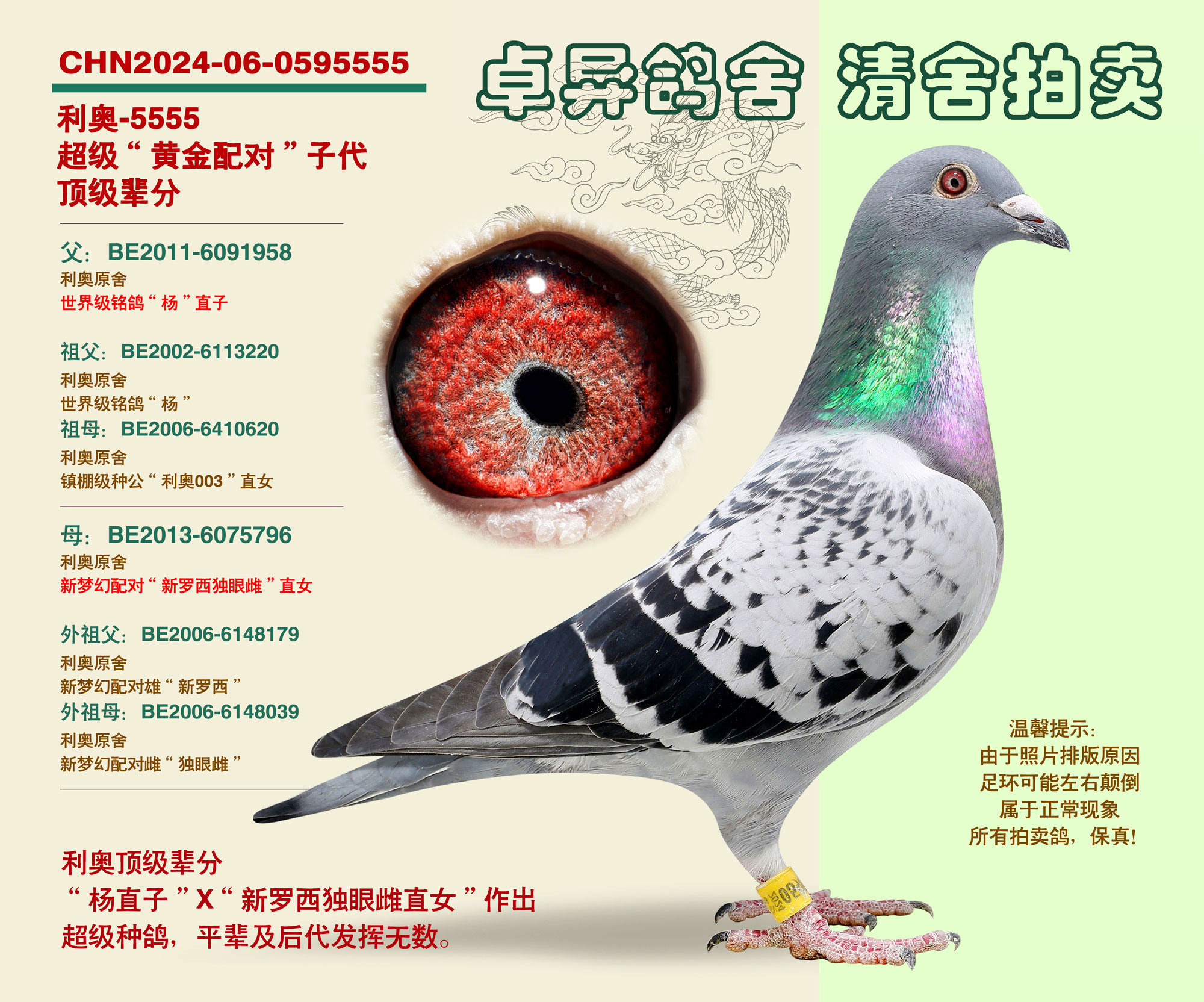 遼寧卓異鴿舍,清舍拍賣,鴿主今年已退休,準(zhǔn)備移居海南養(yǎng)老,退出鴿界,舍內(nèi)諸多世界級超級銘鴿,更是頂級種鴿,斥巨資引進(jìn),清舍拍賣,一羽不留,全部在中信網(wǎng)平臺,周六(27號)周日(28號)結(jié)拍,公平競拍,共81羽種賽鴿,過后再無,