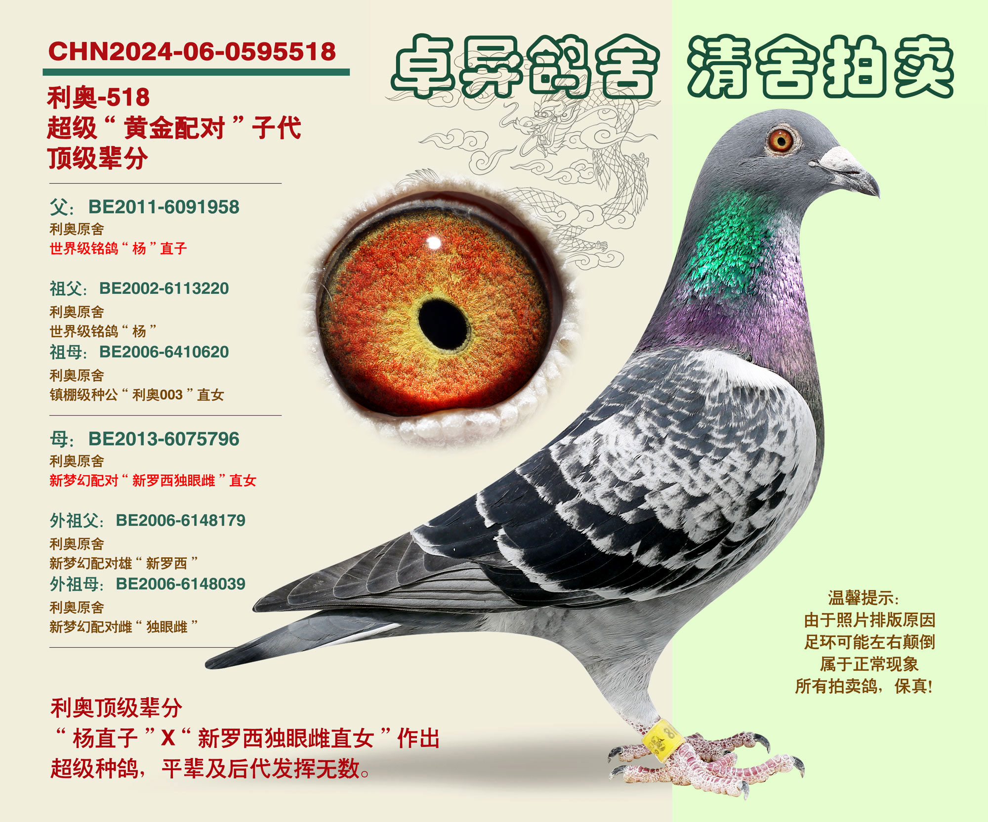 遼寧卓異鴿舍,清舍拍賣,鴿主今年已退休,準備移居海南養(yǎng)老,退出鴿界,舍內(nèi)諸多世界級超級銘鴿,更是頂級種鴿,斥巨資引進,清舍拍賣,一羽不留,全部在中信網(wǎng)平臺,周六(27號)周日(28號)結拍,公平競拍,共81羽種賽鴿,過后再無,