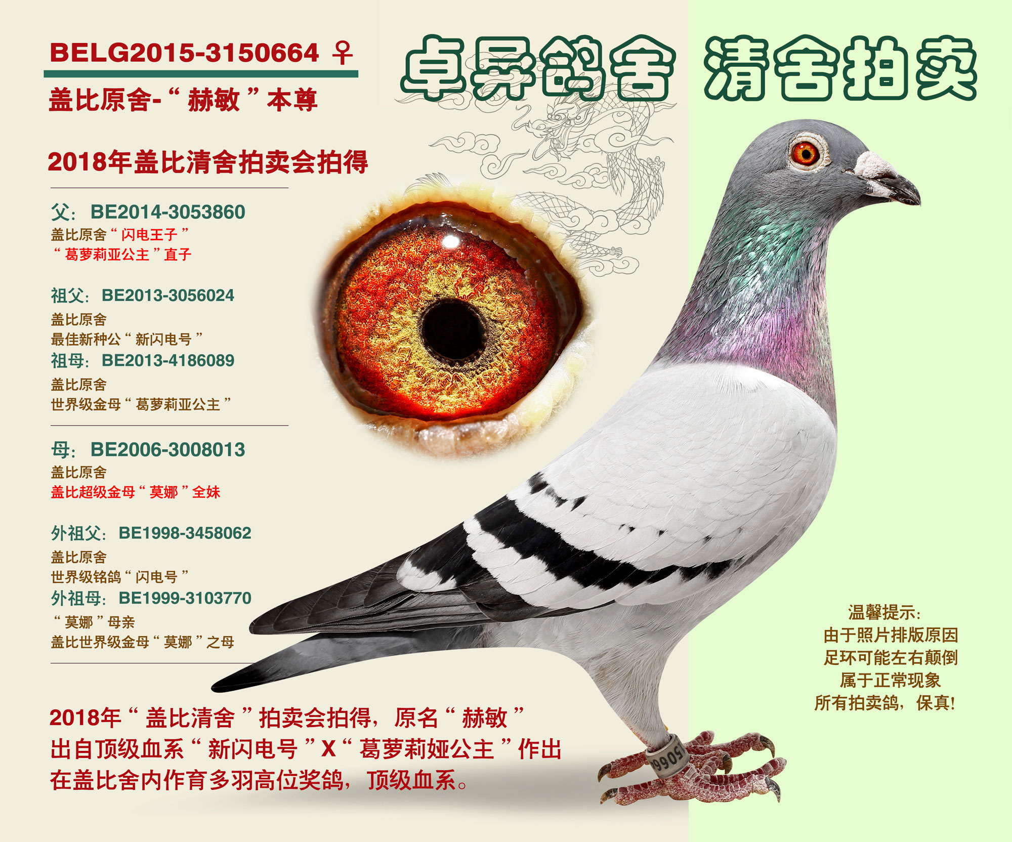蓋比2018年清舍拍賣會(huì)極其推薦的其中一羽,赫敏664-“新閃電號(hào)X閃電號(hào)”,此鴿活力非常好,現(xiàn)肌肉飽滿,零缺點(diǎn),超級(jí)金母,頂級(jí)輩分,本鴿已發(fā)揮3代,作育后代獎(jiǎng)鴿多羽。