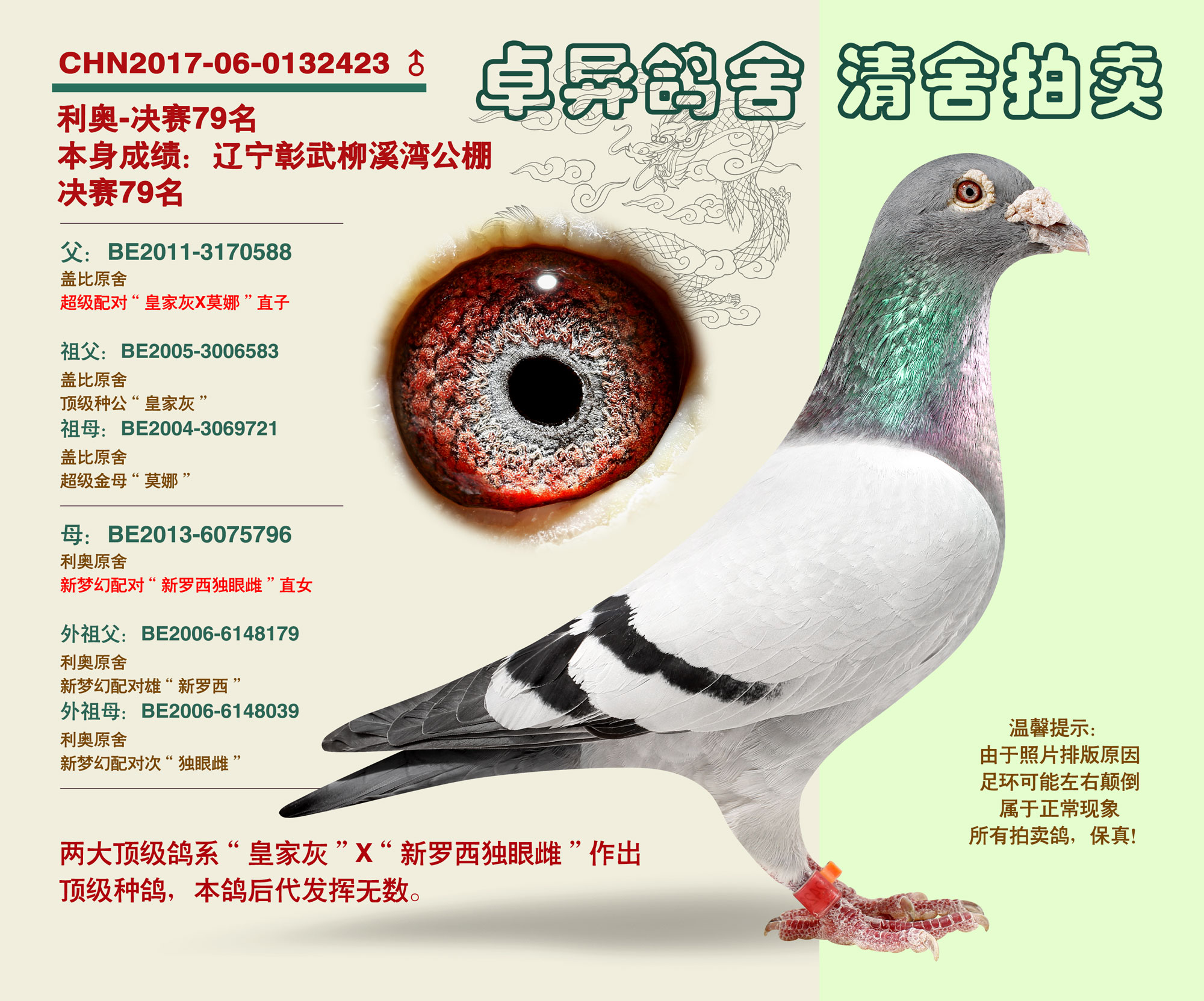 遼寧卓異鴿舍,清舍拍賣,鴿主今年已退休,準(zhǔn)備移居海南養(yǎng)老,退出鴿界,舍內(nèi)諸多世界級(jí)超級(jí)銘鴿,更是頂級(jí)種鴿,斥巨資引進(jìn),清舍拍賣,一羽不留,全部在中信網(wǎng)平臺(tái),周六(27號(hào))周日(28號(hào))結(jié)拍,公平競(jìng)拍,共81羽種賽鴿,過(guò)后再無(wú),