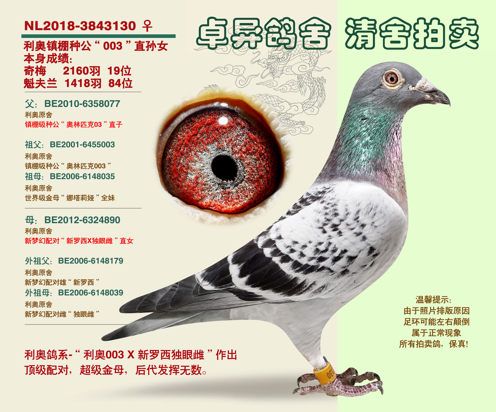 遼寧卓異鴿舍,清舍拍賣,鴿主今年已退休,準(zhǔn)備移居海南養(yǎng)老,退出鴿界,舍內(nèi)諸多世界級(jí)超級(jí)銘鴿,更是頂級(jí)種鴿,斥巨資引進(jìn),清舍拍賣,一羽不留,全部在中信網(wǎng)平臺(tái),周六(27號(hào))周日(28號(hào))結(jié)拍,公平競(jìng)拍,共81羽種賽鴿,過(guò)后再無(wú),