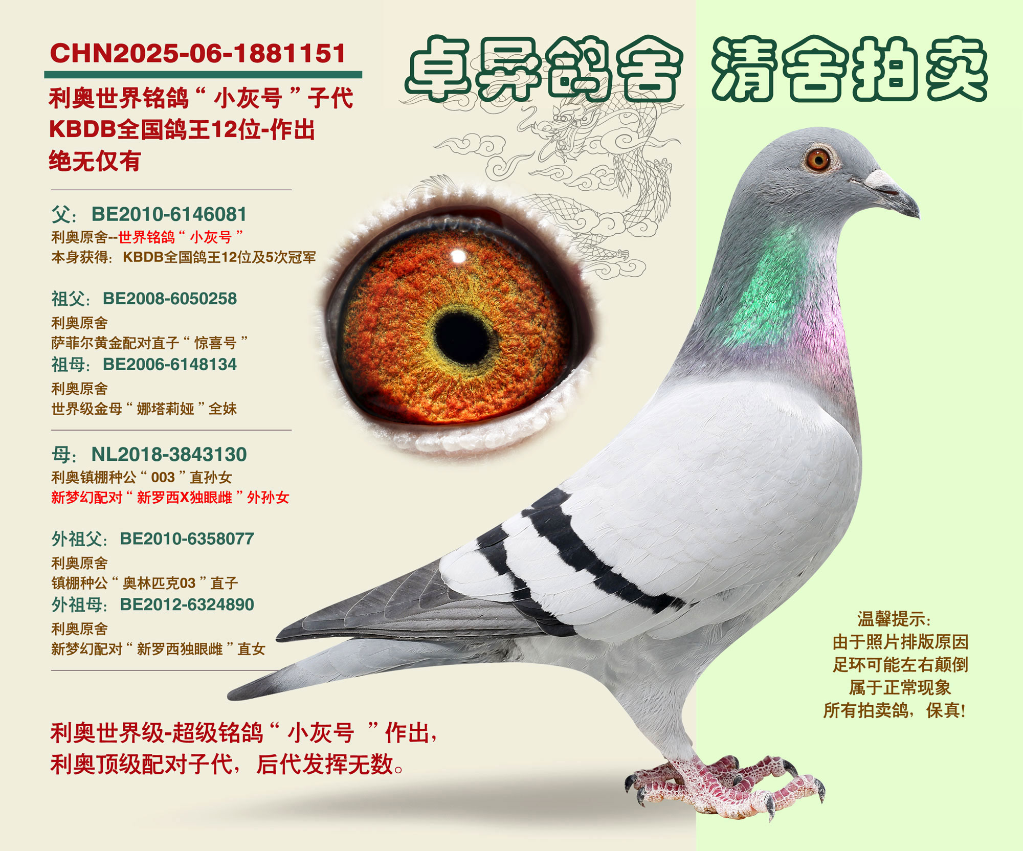 遼寧卓異鴿舍,清舍拍賣,鴿主今年已退休,準(zhǔn)備移居海南養(yǎng)老,退出鴿界,舍內(nèi)諸多世界級超級銘鴿,更是頂級種鴿,斥巨資引進(jìn),清舍拍賣,一羽不留,全部在中信網(wǎng)平臺,周六(27號)周日(28號)結(jié)拍,公平競拍,共81羽種賽鴿,過后再無,