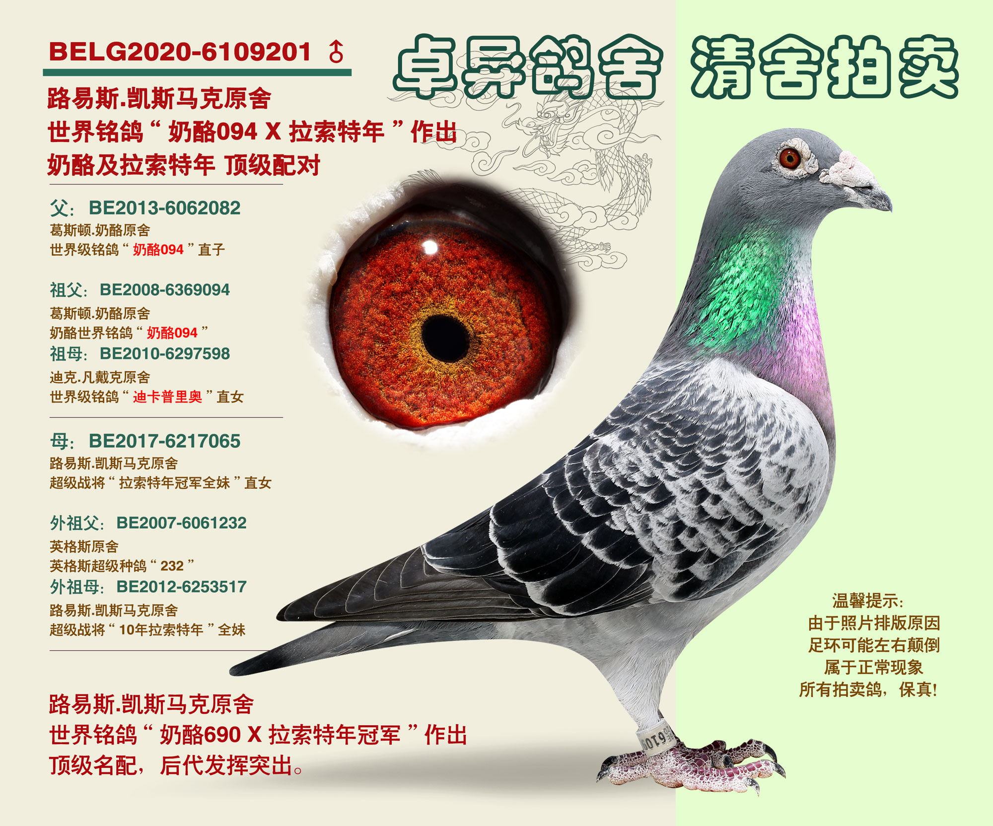 世界級(jí)銘鴿“奶酪094”直孫,頂級(jí)種鴿,此鴿肌肉飽滿,上手一流,孫代已發(fā)輝,原始血統(tǒng)書,隨鴿發(fā)出。