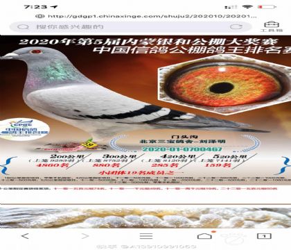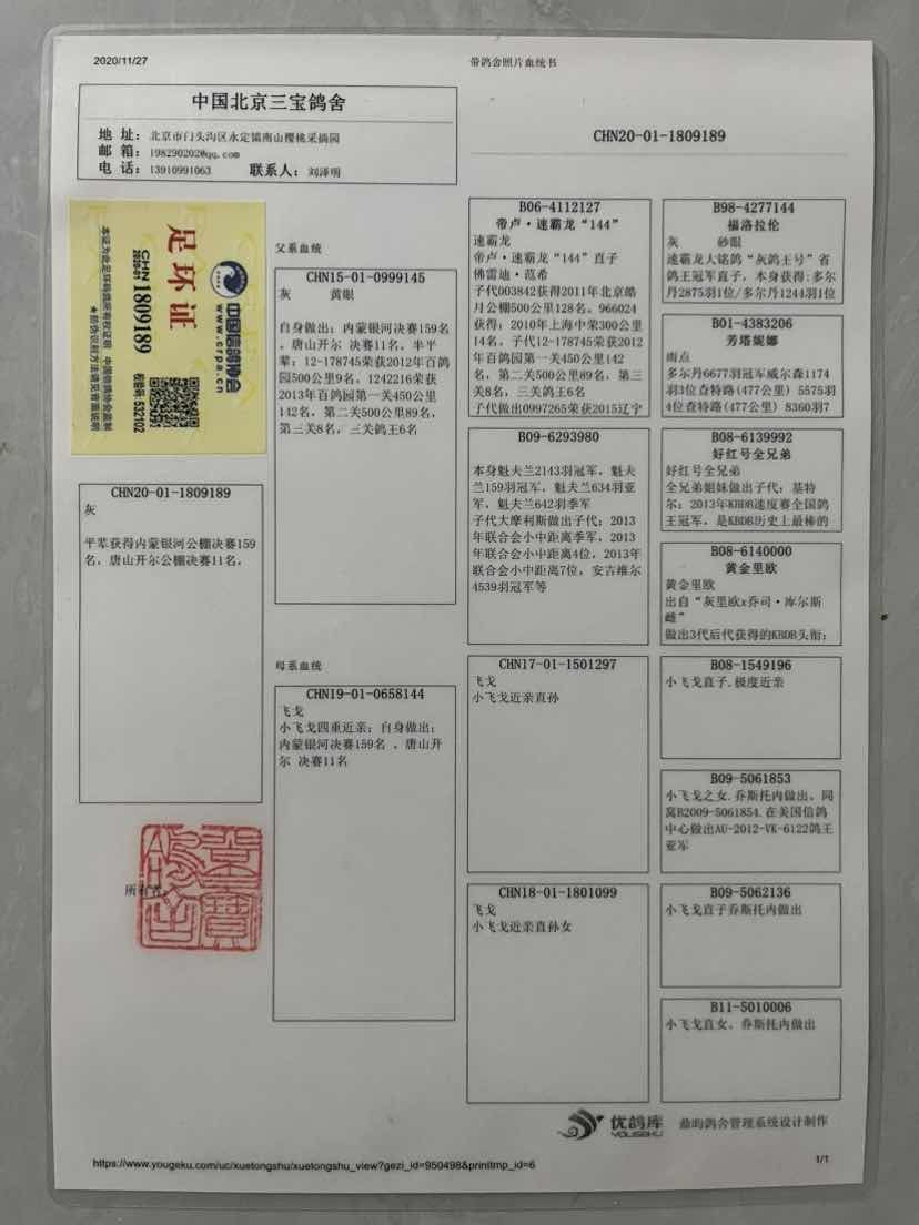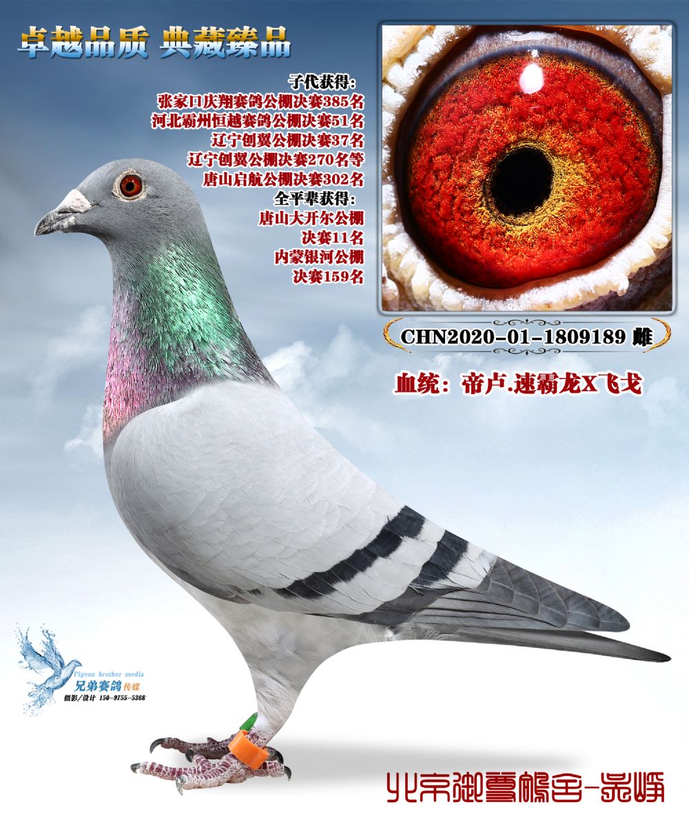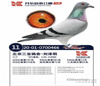 北京三寶鴿業(yè)唐山大開爾11名全平輩帝盧.速霸龍X飛戈2020-01-1809189 雌 黃 灰血統(tǒng):極速飛戈子代獲得:張家口慶翔賽鴿公棚決賽385名河北霸州恒越賽鴿公棚決賽51名遼寧創(chuàng)翼公棚決賽37名遼寧創(chuàng)翼公棚決賽270名等唐山啟航公棚決賽302名全平輩獲得:唐山大開爾公棚決賽11名.149名