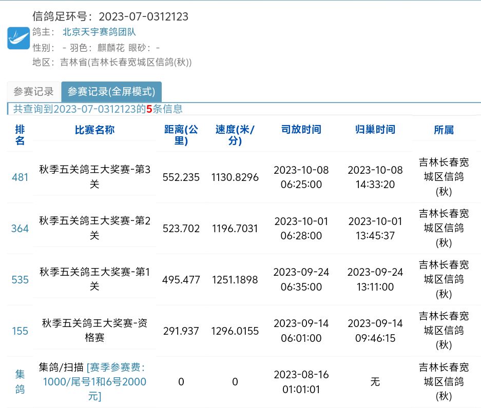 太奧吉林寬城特比-三次500公里成績(jī)鴿