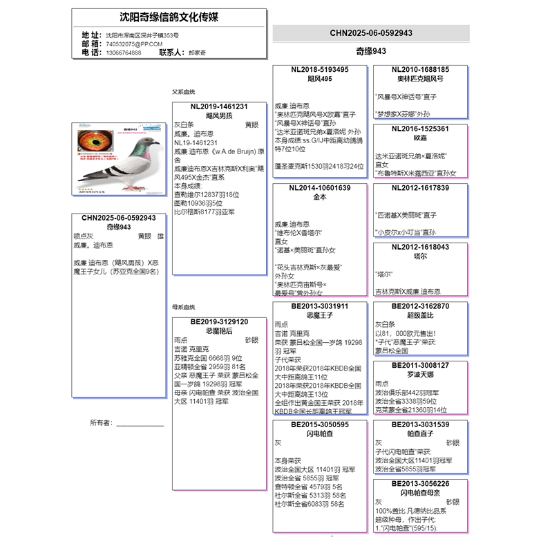 3、注明:請注意看種鴿和血統(tǒng)圖片,有的種鴿環(huán)卡丟失,有些獎鴿無環(huán)卡和獎狀和血統(tǒng),介意請勿出價;