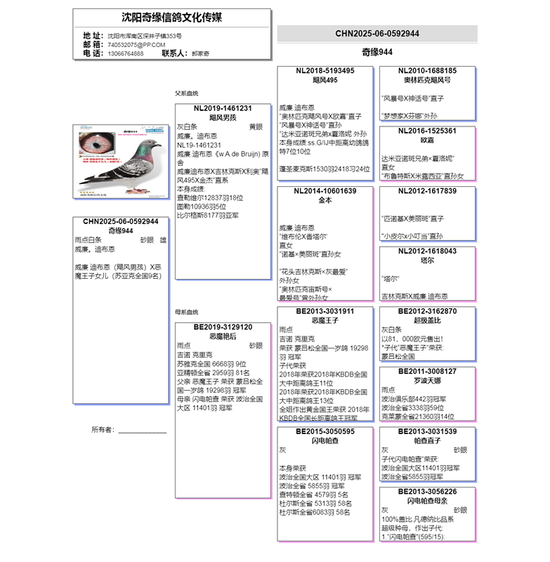 3、注明:請注意看種鴿和血統(tǒng)圖片,有的種鴿環(huán)卡丟失,有些獎鴿無環(huán)卡和獎狀和血統(tǒng),介意請勿出價(jià);