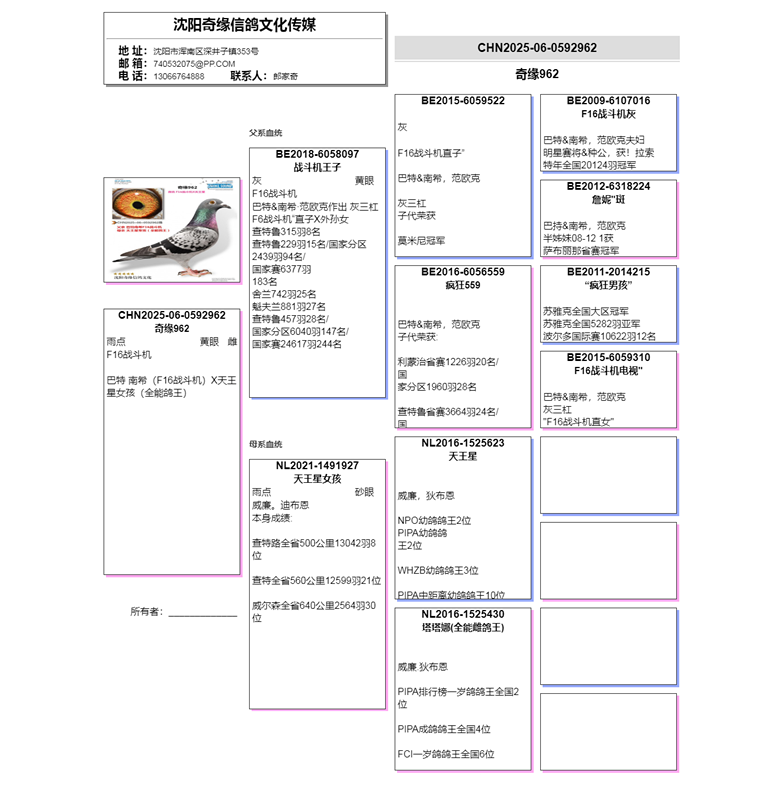 3、注明:請注意看種鴿和血統(tǒng)圖片,有的種鴿環(huán)卡丟失,有些獎鴿無環(huán)卡和獎狀和血統(tǒng),介意請勿出價;