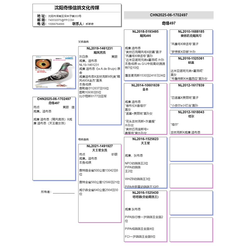 3、注明:請注意看種鴿和血統(tǒng)圖片,有的種鴿環(huán)卡丟失,有些獎鴿無環(huán)卡和獎狀和血統(tǒng),介意請勿出價;