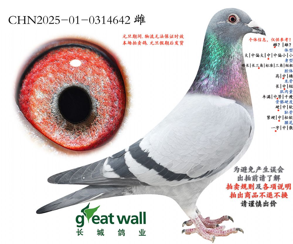 所有拍賣賽鴿,變換鴿舍及周邊環(huán)境;如出現(xiàn)健康問題:發(fā)鴿之日起7日內聯(lián)系;如有做育問題:秋季拍賣鴿,3個月內聯(lián)系反饋;春節(jié)過后所售拍賣鴿,做育問題請在1個月內聯(lián)系反饋。請鴿友收到鴿子實驗配對做育,逾期本鴿業(yè)將不負責。不要1-2年后再聯(lián)系我們反饋問題,時間長了,無法斷定是在本舍還是您的鴿舍出現(xiàn)的問題。