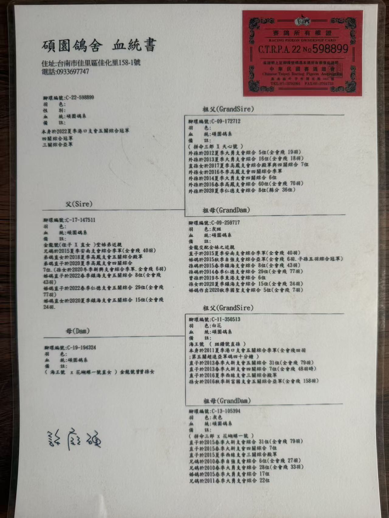 - 當(dāng)前查看拍賣鴿:臺(tái)灣碩園鴿系 本身成績(jī)五關(guān)綜合冠軍