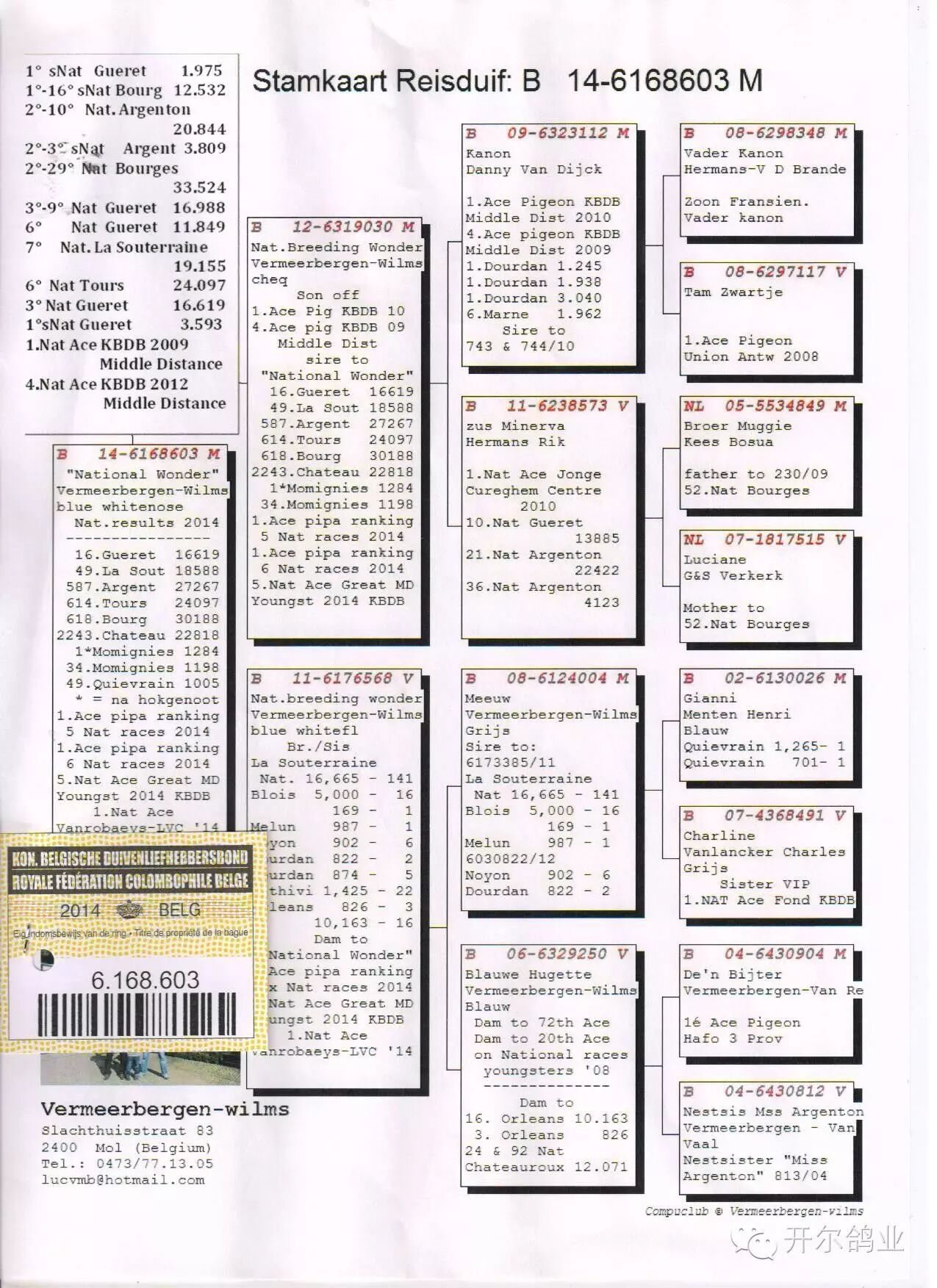 比利時摩爾(Mol, BE)的盧克•福麥爾貝根(Luc Vermeerbergen)和羅比•威恩斯(Robby Wilms)奪得了安特衛(wèi)普省6場幼鴿賽中的2個冠軍,如此高的冠軍獲得率,鴿友們可以叫他們?yōu)榘俜种?3先生。他們成功培育出全國鴿王——“全國奇跡號”(National Wonder),2014年比利時KBDB大中距離五關(guān)/六關(guān)冠軍,它還拿下了比利時KBDB大中距離鴿王幼鴿組第5位以及2個PIPA評選鴿王冠軍。