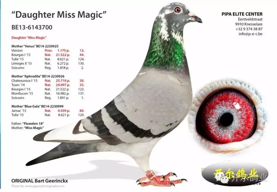 巴特.吉林克斯原舍,她出自2013年尼特拉奧林匹克全能代表鴿:超級(jí)雌鴿“神奇小姐”(Miss MagicBE10-6143162)。她與頂級(jí)種鴿“絲絨18號(hào)”(Fluwelen 18 BE05-6052018)進(jìn)行配對(duì),“絲絨18號(hào)”作育的“第一女郎”(First Lady)獲得比利時(shí)超過(guò)4場(chǎng)全國(guó)賽最佳幼鴿亞軍,“霹靂美拉”(Primera)獲得查特路全省3147羽冠軍
