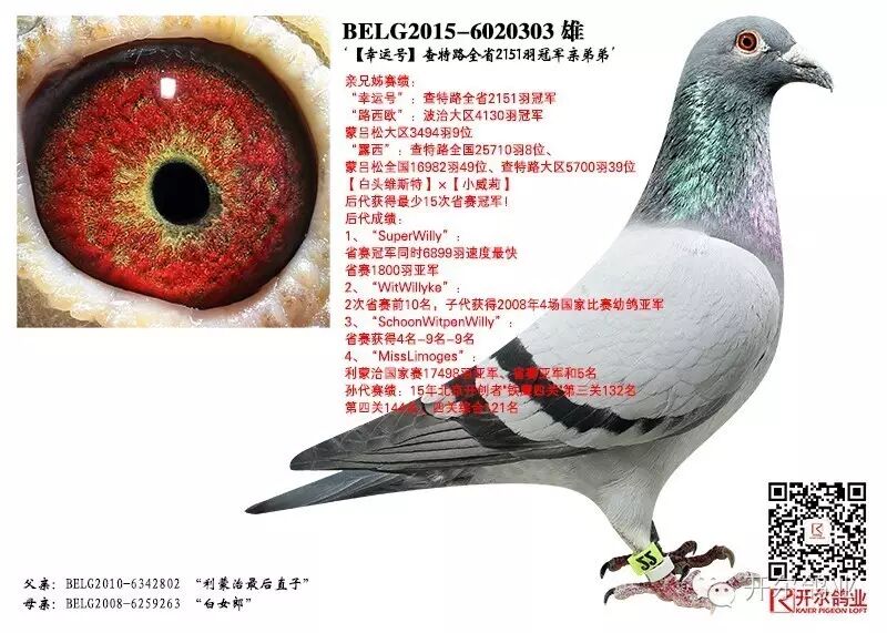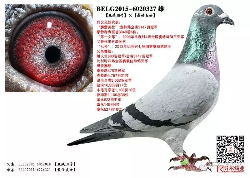 吉林克斯【絲絨18號(hào)】子代,超級(jí)雌鴿“神奇小姐”與頂級(jí)種鴿“絲絨18號(hào)”進(jìn)行配對(duì),“絲絨18號(hào)”作育的“第一女郎”獲得比利時(shí)超過(guò)4場(chǎng)全國(guó)賽最佳幼鴿亞軍,“霹靂美拉”獲得查特路全省3147羽冠軍,蒙特利查聯(lián)省3049羽5位