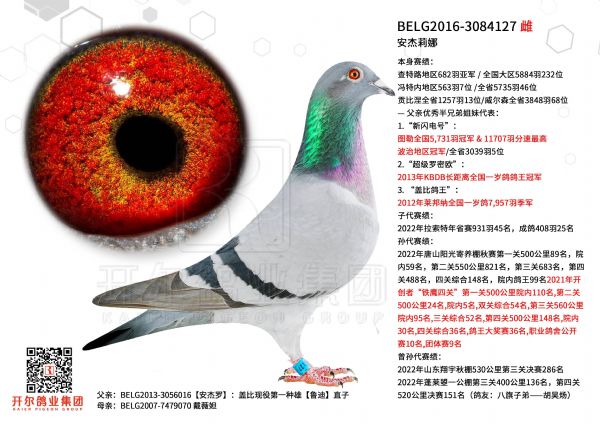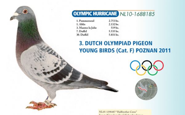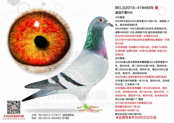 20名與冠軍鴿第一梯隊(duì)歸返,源自威廉迪布恩血脈,是奧林匹克颶風(fēng)雙重近親回血,父親是墨菲定律同父弟弟,由赫爾曼與瑪莉安娜027作育,赫爾曼為南圖17186羽亞軍,瑪莉安娜027是奧林匹克颶風(fēng)外孫女,自身斬獲19年SS當(dāng)日歸長(zhǎng)距離鴿王季軍。母親由奔騰年代與墨菲定律直女墨菲403號(hào)作育,是PIPA速度鴿鴿王全國(guó)17位、亞拉斯12930羽10名,奔騰年代是奧林匹克颶風(fēng)直孫,連續(xù)收獲馮特內(nèi)萬(wàn)羽賽事的兩冠一亞。